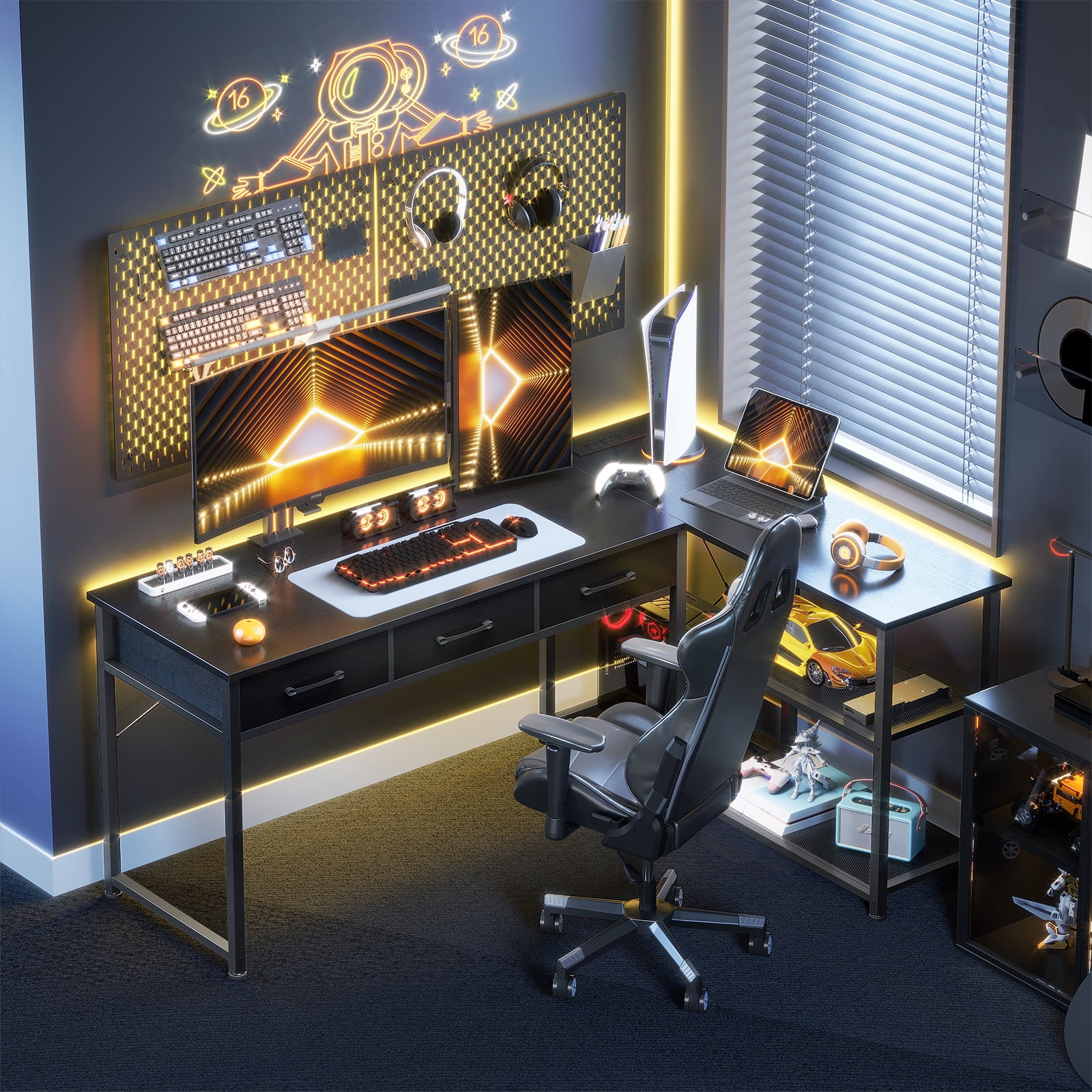 $142.7542 Inch L Shaped Gaming Desk with DIY Pegboard, Computer Desk with Adjustable Monitor Stand, Power Outlets & LED Lights, Reversible Office Desk Base : Carbon Fiber Color: Carbon Fiber Blue Shape: L-Shape Desk Design: Computer Desk Additional Features: Mini DIY Pegboard, Monitor Stand, Adjustable Storage Rack Included Components: Built-in USB Port
