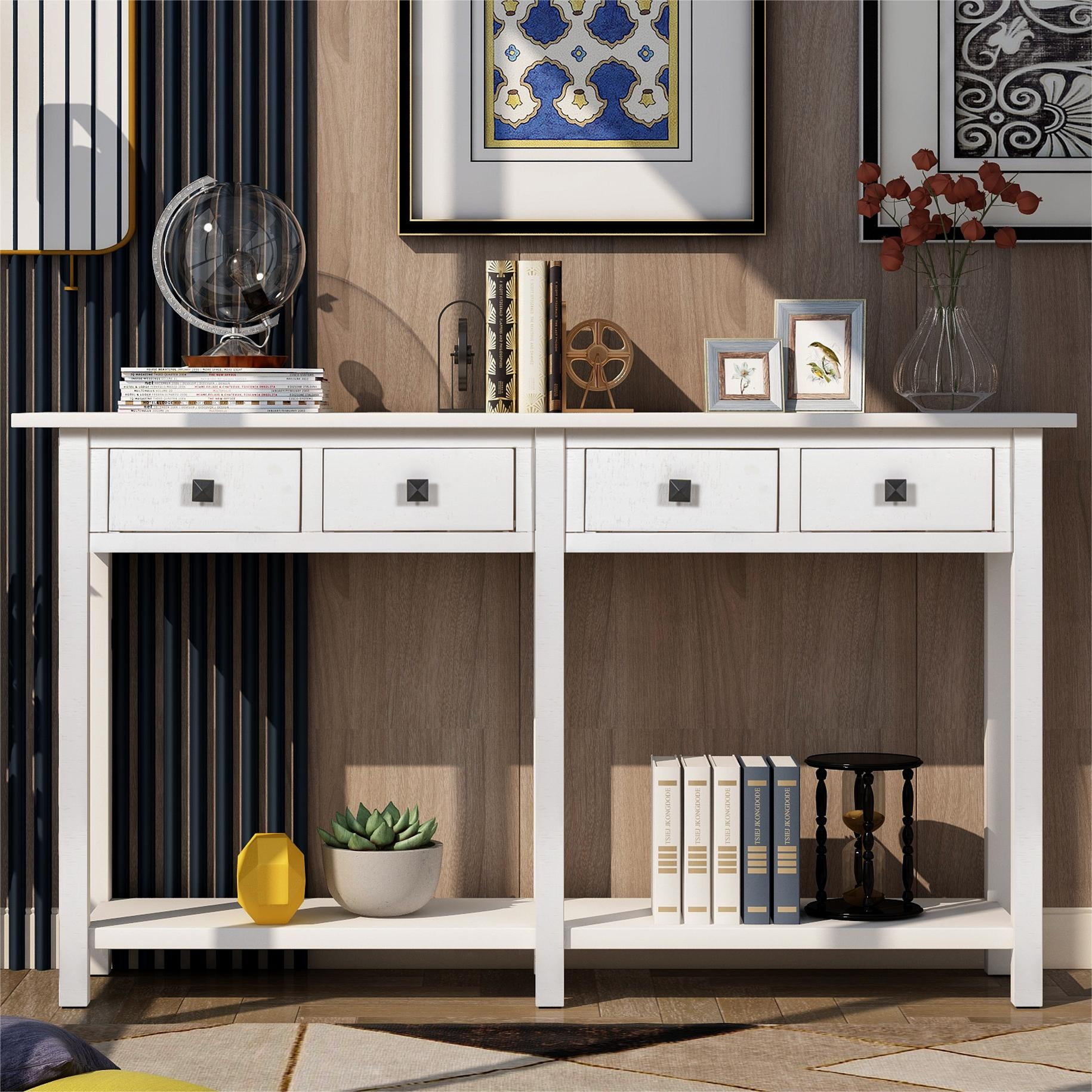 59″ Modern Long Console Table with 4 Drawers,Sofa Table Entryway Living Room Table with Shelves for Hallway,Foyer,Ivory White