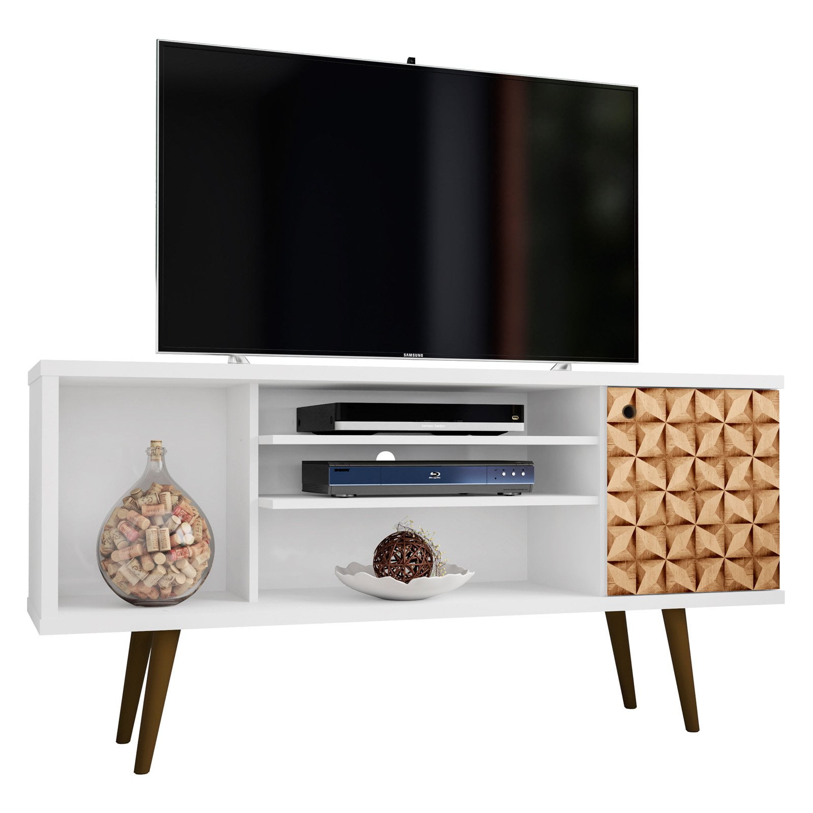 $151.8653.14″ Mid Century – Modern TV Stand with 5 Shelves and 1 Door, White and Brown Feature:- Free Standing TV Stand for Living Room and Bedroom use. Upon Assembly, Measures: 53.14 in. Length, 26.57 in. Height, 14.17in. Depth. Recommended for a 46″ -50″ TV. Includes 2 Media Holes for Wire Management. Fashionable Splayed Legs made from Solid Wood for Extra Durability. Includes 1 Large Open Cubby Space, 1 Concealed Cubby Space and 3 Center Shelves with 1 Side Semi- Opened. 90 Open Door Style with Ring Handles and Sleek Line Indent Design. Home Assembly Required. All Hardware Included. Frame Material:- MDP and MDF Feet Material:- Solid Wood Back Finish:- No Shelves:- 5 Drawers:- 0 Doors:- 1 Shelf Type:- Fixed Shelves Drawer Type:- NA Door Type:- 90 Open Door Style Weight Capacity:- Top Base Shelf: 44 Lbs. Lower Base Shelf: 33 Lbs. and 11 Lbs. per internal Shelf.Description: The Liberty 53.14 Mid-Century Modern TV Stand is the perfect blend of quality craftsmanship, brilliant design, and purposeful functionality. Featuring a large open compartment, one hidden cubby, and three center shelves to create the ultimate entertainment center perfect for stashing DVDs, board games, electronics, and media accessories. Free standing and easy to maneuver, this piece will mix well with any decor and its artful grooves will create a statement in any space.Specifications: Free Standing TV Stand for Living Room and Bedroom use. Upon Assembly, Measures: 53.14 in. Length, 26.57 in. Height, 14.17in. Depth. Recommended for a 46″ -50″ TV.