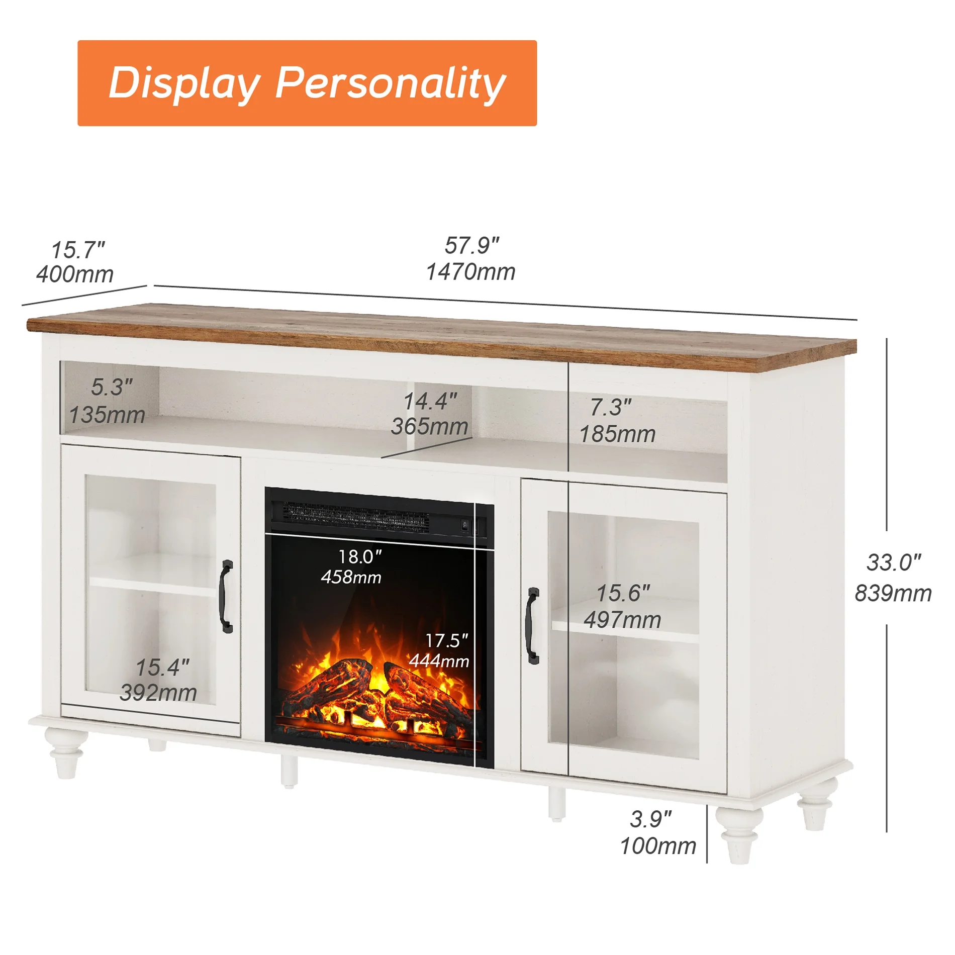 $223.5958-Inch White Highboy TV Stand with Electric Fireplace, Farmhouse Style Entertainment Center with Glass Door and Storage Console