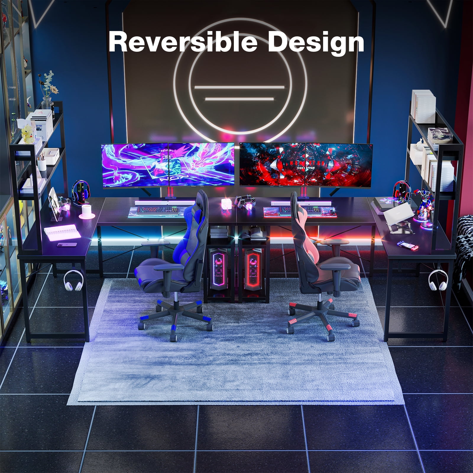 59″ Reversible L-Shaped Gaming Desk with Hutch, Office Desk with Storage Shelves for Home Office, Corner Computer Desk with Headphone Hook, Black