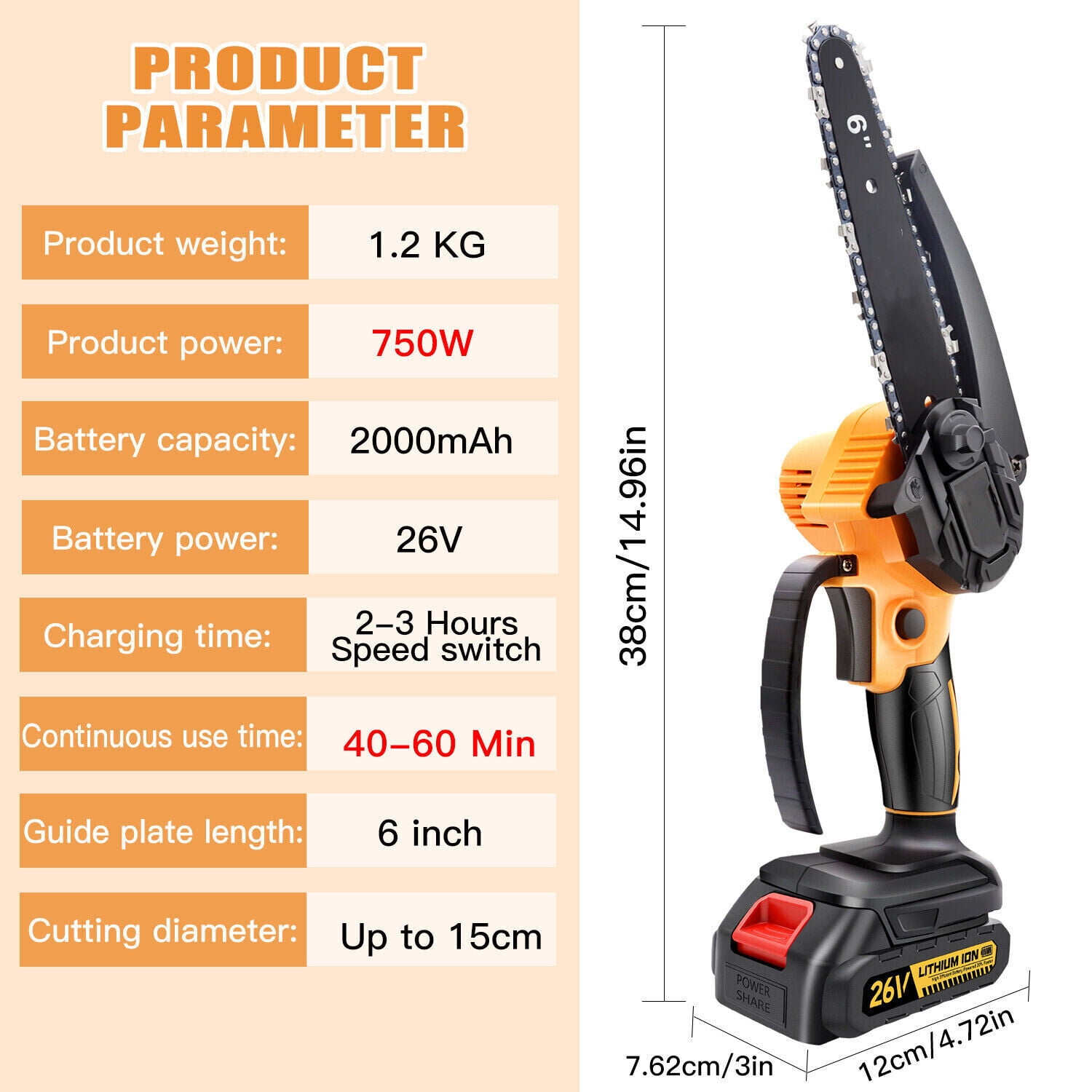 $42.996″ Mini Chainsaw 26V Battery Powered Chainsaw ,with Safety Lock,with 2 Batteries 2 Chains, 6-inch Cordless Handheld Chain Saw Wood Cutter Features: 【Handheld Mini Chainsaw 6 Inch】 Compared with normal 4 inch small chainsaw, this 6 inch handheld electric saw can easily cut thicker trees. The non-slip and ergonomic handle is more suitable for the palm of your hand and easy to operate. 【Large Capacity Battery Pack】 We know that the battery life of a cordless chainsaw is your most concerned issue, so we providing 750W super strong power, which can provide a longer battery life. After being fully charged, the battery mini electric saw can continuously cut branches for 40-50 minutes. The charging time is about 2 to 3 hours. 【High Quality Small Tree Cutter】Rechargeable mini cordless chainsaw comes with a low kickback bar and high hardness quenched chain.The quick heat dissipation ensures the motor runs efficiently.This high-quality tree saw is tough and wear-resistant, sharp and smooth cutting, not easy to jam the chain, fast cutting, and longer service life. 【Compact Size and Safe】With its 1kg slim body, small in size, this portable chainsaw is very comfortable to hold and convenient to fit into tight or awkward spaces. Even women can control it with ease. The switch protection lock and the shift button protection function makes it more safe and reliable. 【What Will You Get】This electric chainsaw is equipped with 2 x batteries and 2 x chains. In addition, 1 x gloves, 1 x screwdriver, 1 x Box, 1 x Charge Adapter and a detailed English manual are provided. Specification: – Color:YELLOW – Weight: 1.5KG – Power: 750W – Battery capacity: 1500 mA – Battery power: 26V power lithium battery – Charging time: 90-120 minutes – Continuous use time: 40-50 minutes – Guide plate length: 6 inch – Cutting diameter: Up to 15cm Package: 1 x 6 inch Mini Electric Chainsaw 2 x Lithium battery 2 x Chain 1 x Charge Adapter 1 x Screwdriver 1 x User manual 1 x Cut-proof gloves 1 x Box