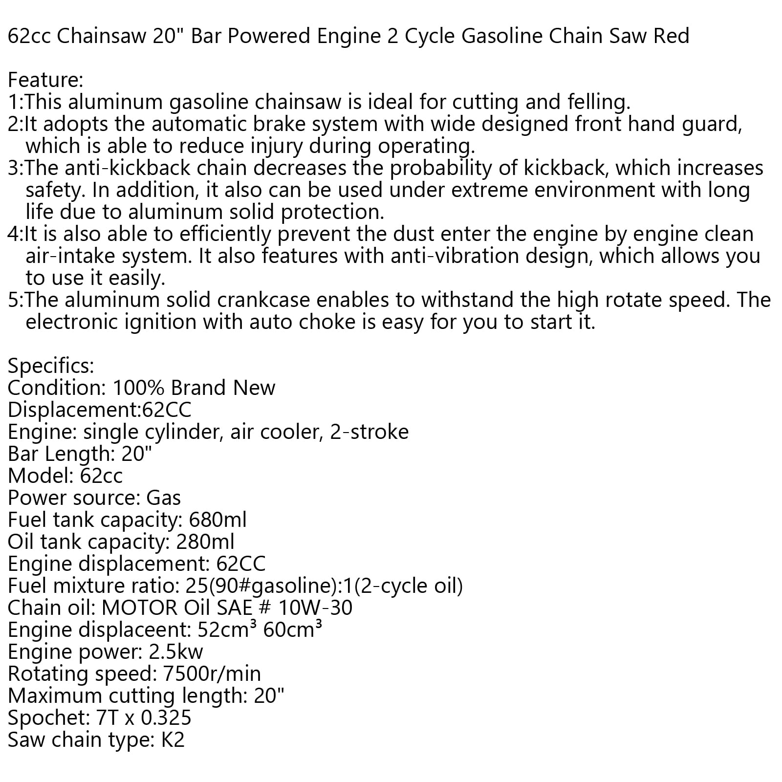 $94.59Original price was: $94.59.$79.97Current price is: $79.97.62cc Chainsaw 20″ Bar Powered Engine 2 Cycle Gasoline Chain Saw Red Feature: 1:This aluminum gasoline chainsaw is ideal for cutting and felling. 2:It adopts the automatic brake system with wide designed front hand guard, which is able to reduce injury during operating. 3:The anti-kickback chain decreases the probability of kickback, which increases safety. In addition, it also can be used under extreme environment with long life due to aluminum solid protection. 4:It is also able to efficiently prevent the dust enter the engine by engine clean air-intake system. It also features with anti-vibration design, which allows you to use it easily. 5:The aluminum solid crankcase enables to withstand the high rotate speed. The electronic ignition with auto choke is easy for you to start it. Specifics: Condition: 100% Brand New Displacement:62CC Engine: single cylinder, air cooler, 2-stroke Bar Length: 20″ Model: 62cc Power source: Gas Fuel tank capacity: 680ml Oil tank capacity: 280ml Engine displacement: 62CC Fuel mixture ratio: 25(90#gasoline):1(2-cycle oil) Chain oil: MOTOR Oil SAE # 10W-30 Engine displaceent: 52cm³ 60cm³ Engine power: 2.5kw Rotating speed: 7500r/min Maximum cutting length: 20″ Spochet: 7T x 0.325 Saw chain type: K2 Package Included: 1x Chainsaw set Note: Long time use is easy to get hot and burn the side board of the chain saw. It is suitable for general garden pruning. Please Do not use for professional logging. 1