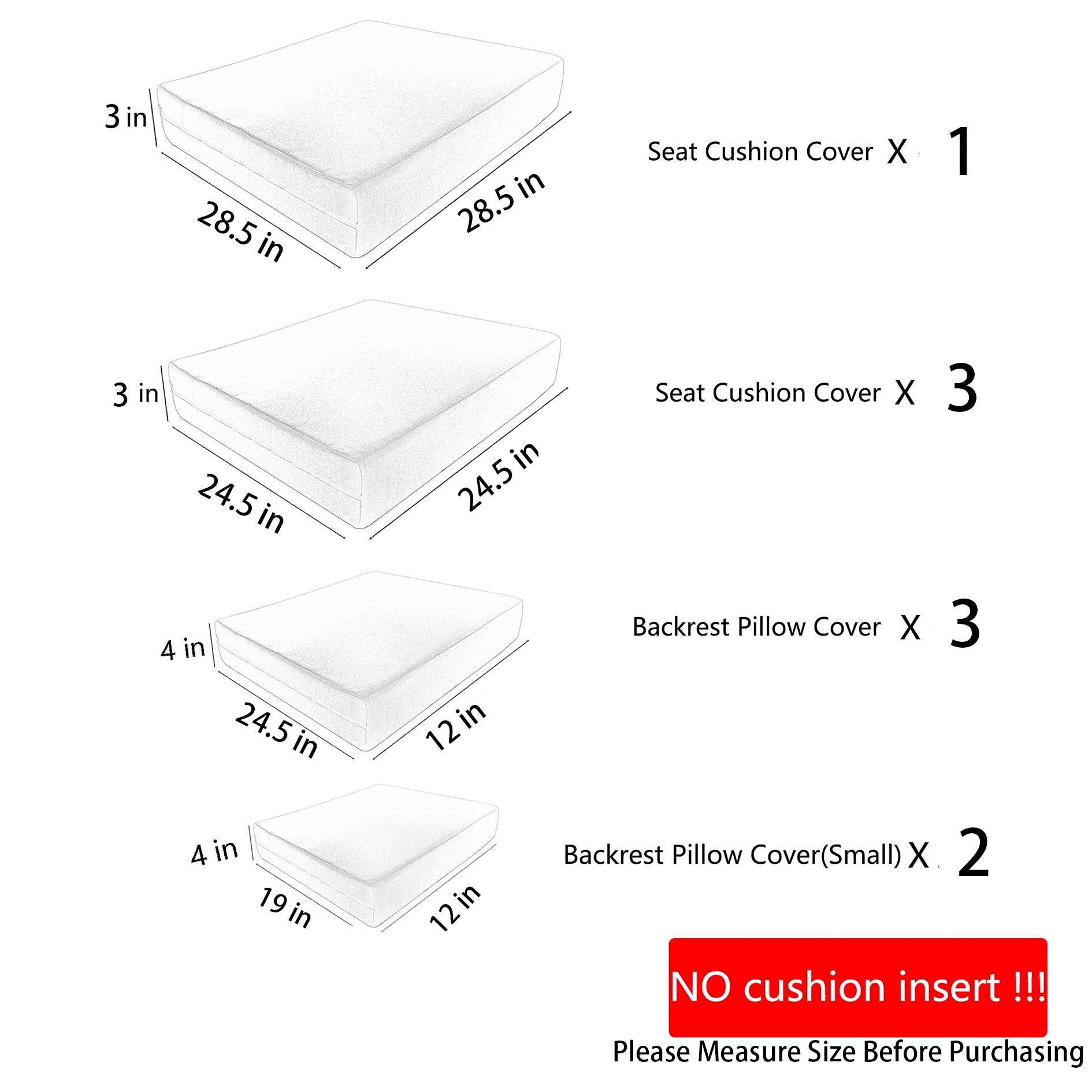 $42.99You can make various combinations of outdoor furniture according to your needs. The non-printed minimalist fabric cover can better match your furniture style. Outdoor cushion covers are made of thicker high quality yarn dyed polyester fabric woven for durability, comfort and softness. Durable in the sun, fade resistant (every yarn has been treated with UV resistance), soft and comfortable. Water resistant, not completely 100% waterproof, the built-in TPU compartment prevents water from seeping in. We designed stacked stitching to improve the fastness of the zipper and equipped with heavy duty aluminum zippers, the zipper has been opened and closed thousands of times to ensure smoothness in use and easier to install. If you encounter any problems, please feel free to ask us, we will provide you with service within 24 hours. You can choose the right size patio cushion replacement cover according to your cushion size”. Set includes: 3Pack-Seat cushion covers 3Pack-Back cushion covers 2Pack-Armrest cushion covers 1Pack-Ottoman cushion covers Attention: Covers Only Dimensions: Seat cushion covers: 24.5L*24.5W*3H Inch Back cushion coversr: 24.5L*12W*4H Inch Armrest cushion covers:19L*12W*4H Inch Ottoman cushion covers:28.5L*28.5W*3H Inch