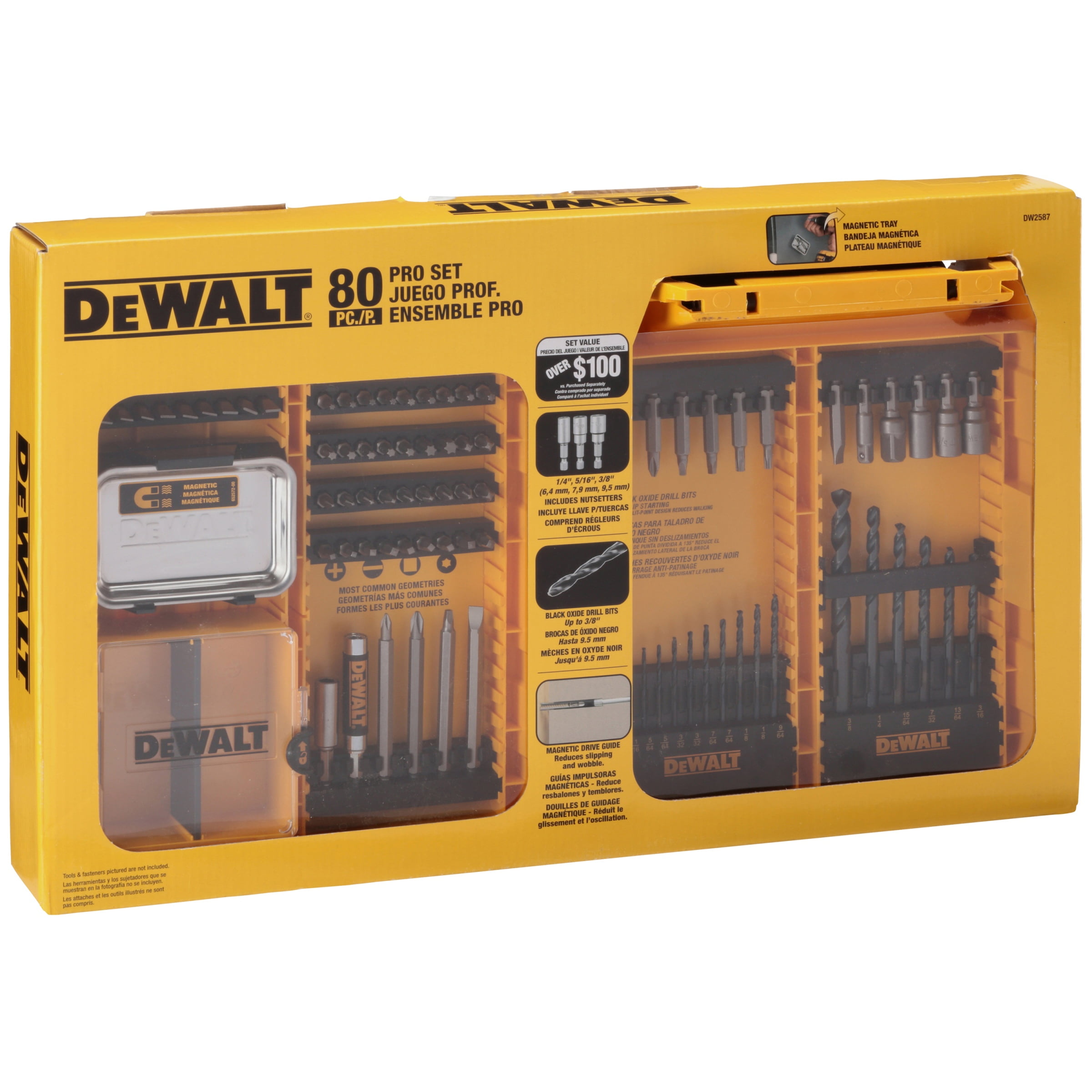 $65.92The DeWalt Drilling Driving Set adds a range of attachments to your tool collection. The drill bits are made of black oxide for durability and reliable performance. They also come in multiple sizes inside a plastic tray with marked slots for organization. A magnetic DeWalt drive guide is included to help prevent slips. There are also several screwdriver bits to choose from. This 80-piece set comes with a magnetic tray to keep loose bits and fasteners within reach. A carrying handle offers convenient portability.