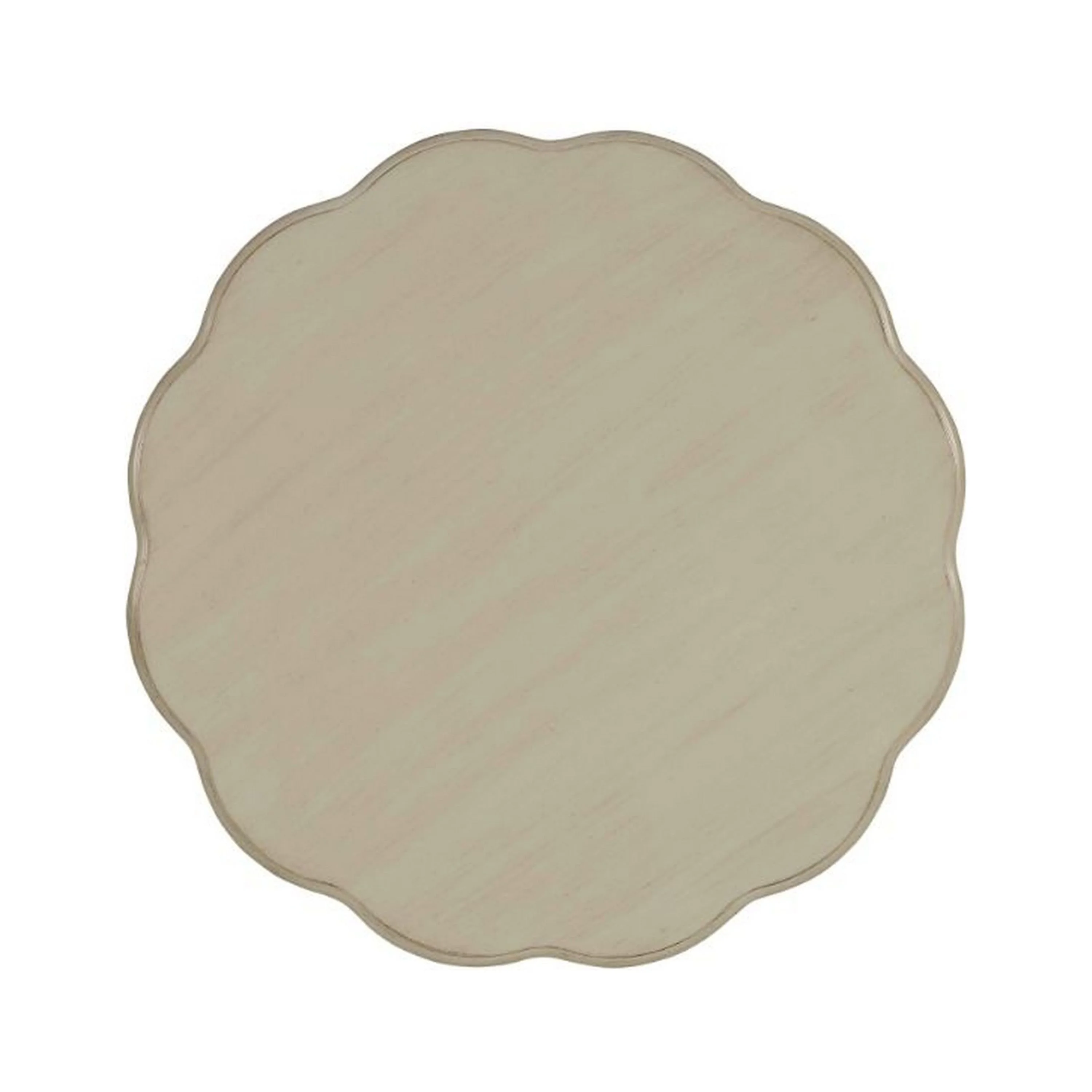 $126.70Fordon Round End Table Scalloped Top Antique White- ACME The French country-inspired Fordon occasional end table is gracefully designed and made from quality materials. Scalloped round table top turned legs and a bottom shelf each piece is carefully crafted while superb functionality is kept in mind. This occasional collection is available in both of coffee and end table in antiqued white. SPECIFICATION: One end table Constructed from a combination of mdf and solid wood French style inspired design in antique white finish It comes with scalloped round table top Supported on turned legs Comes with an exquisitely crafted bottom shelf 23.62L x 23.62W x 23.86H in inches