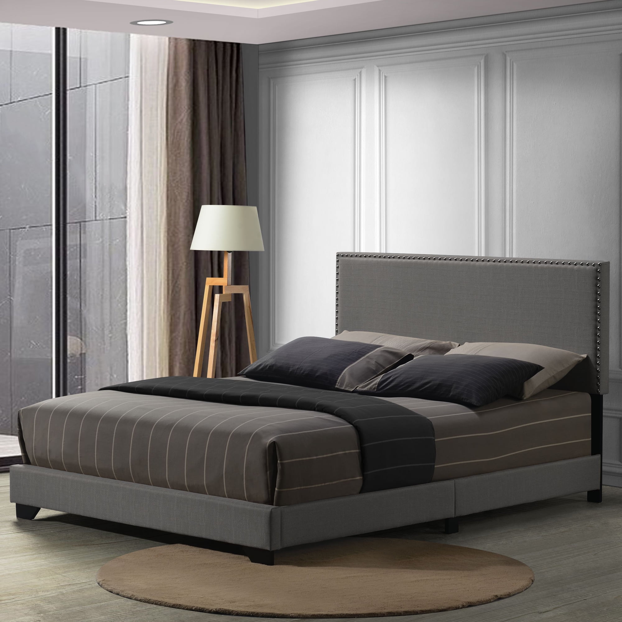 $146.10Solid color accent and ultra-sleek minimalist associate your bedroom with a modern aesthetic. Warm and soft fabric fully covers the bed from headboard to side rails to complete a comfy casual look. Nail head trim adds a decorative border to the headboard, accentuating its crisp clean lines. A sturdy slat system is added to the bed frame for supporting your bedding and box spring.