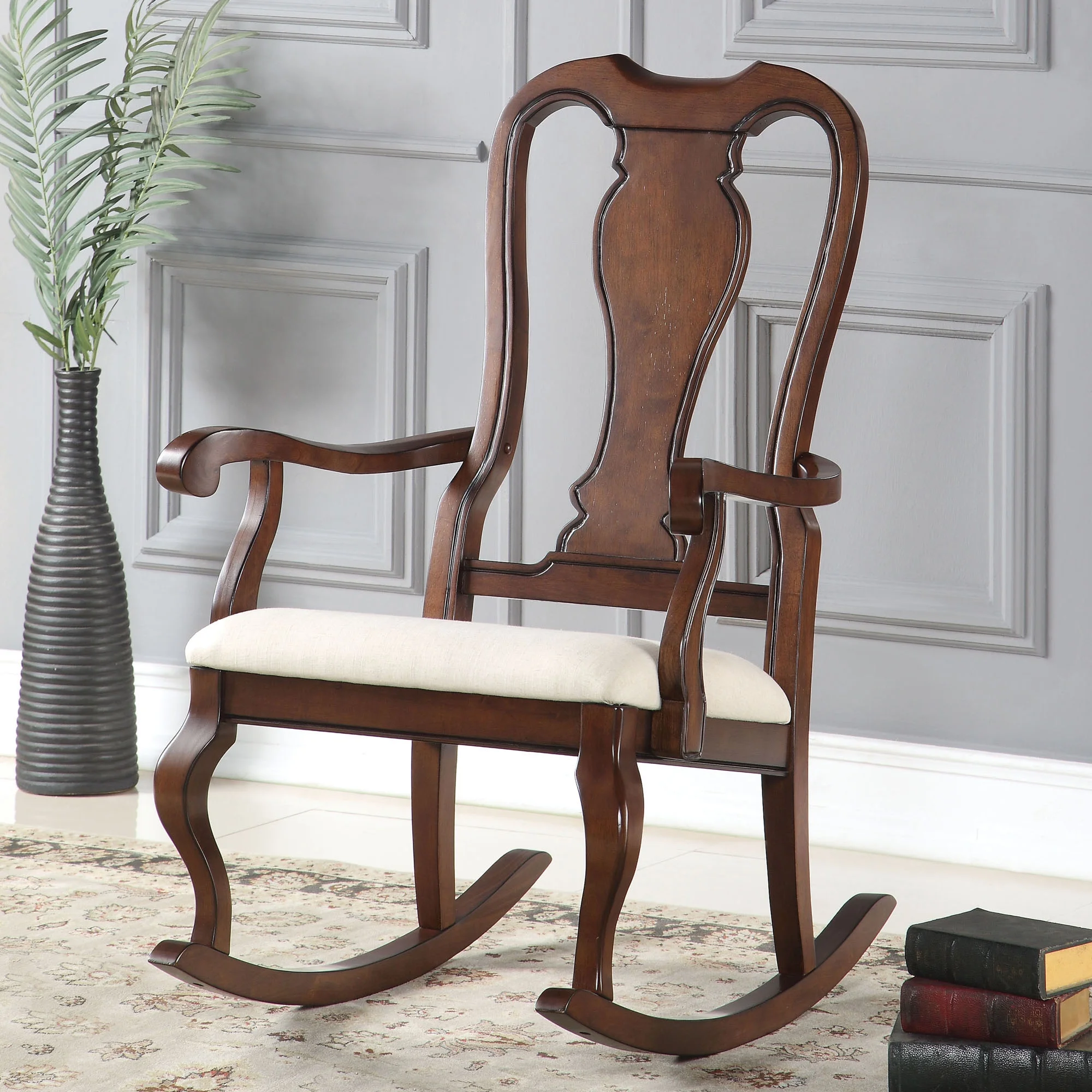 $194.72The beautiful Sheim wooden rocker will It will be the perfect addition to your living room, sunroom or deck. This graceful rocking chair features a padded seat and tall Queen Anne back for extra comfort. The smooth rocking motion and sturdy durable construction ensure that you’ll be able to relax for years to come.
