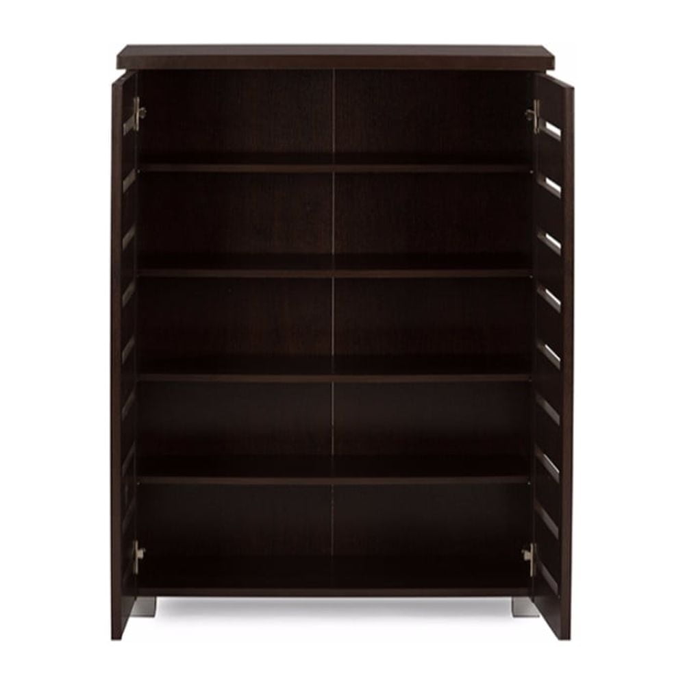 $141.90Original price was: $141.90.$111.79Current price is: $111.79.Adalwin Modern and 2-Door Dark Brown Wooden Entryway Shoes Storage Cabinet Start organizing your collection of shoes with this practical shoe cabinet. Featuring dark brown PU veneer finish, PVC legs in silver powder coated and a sleek stylish contemporary design, this quality made shoe cabinet easily matches any d?cor. It features slatted doors and four fixed shelves that stores up to 15 pairs of shoes. Great for organizing your favorites, just perfect for your storage needs! Adalwin shoe storage cabinet is made with open slat doors allowing air circulation which is essential for the storage of shoes helping to keep them mold free. Made in Malaysia, the shoe storage cabinet requires assembly. Specifications: Finish: Dark brown finish 2-door version comes with 4 fixed shelves providing 5 shelving space 2-door version fits up to 15 pairs of shoes