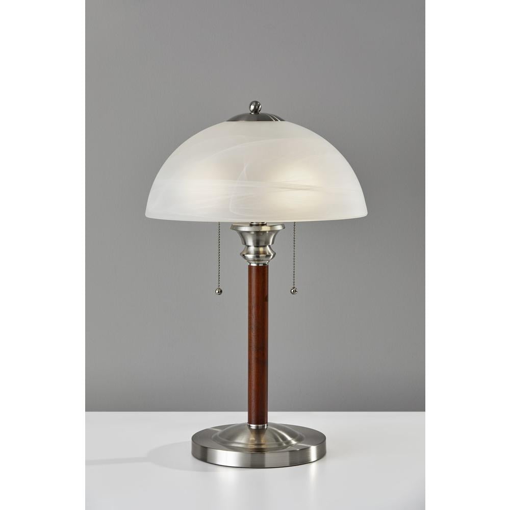 $87.67A traditional silhouette meets modern design in the Lexington table lamp. The dark walnut rubber wood body holds an alabaster frosted glass dome shade and is accented with a satin steel base, cap and finial. Two pull chain switches, each with on/off functionality allow for a dim or bright light setting. This lamp has a black cord and is smart outlet compatible. Bulbs are not included.