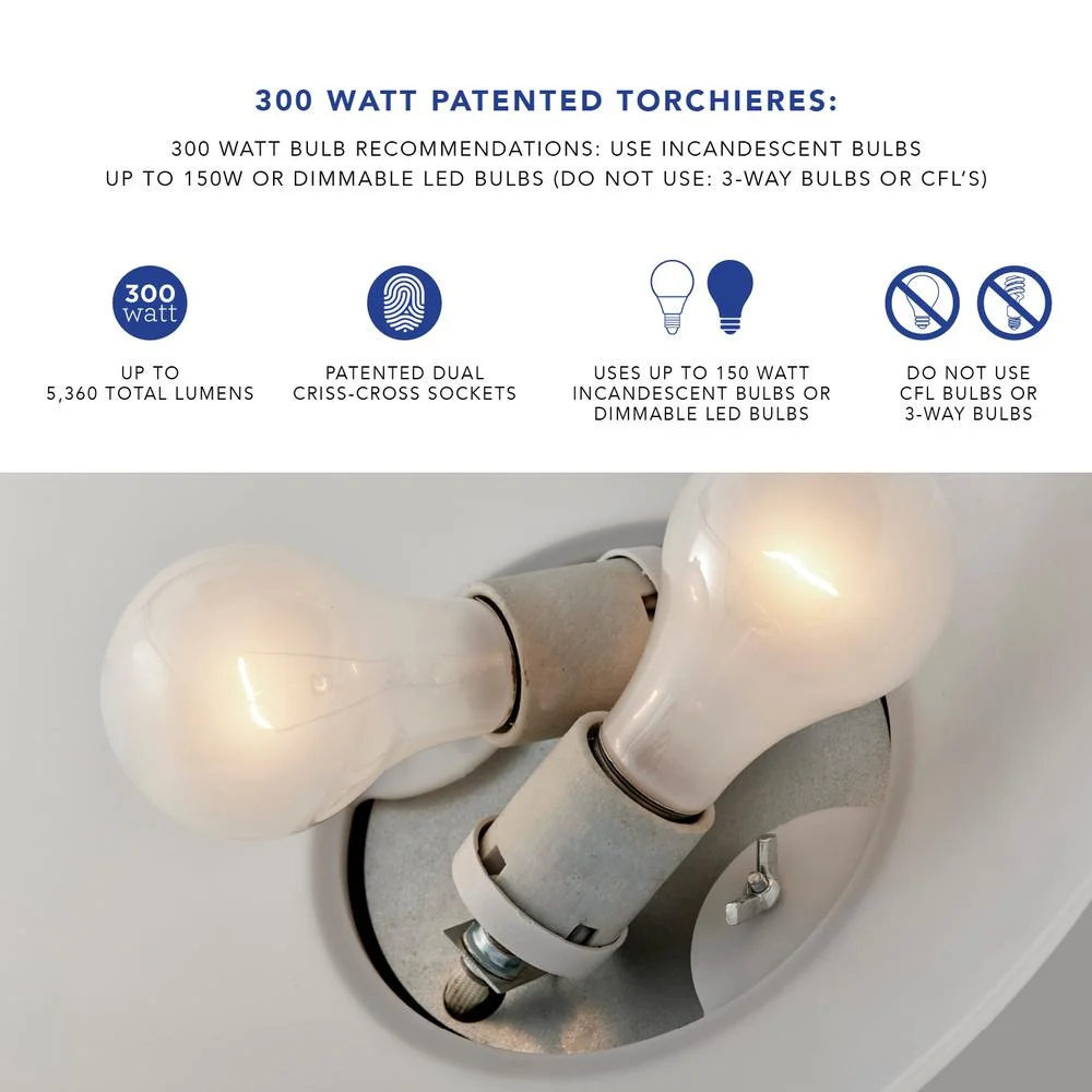 $57.61A simple, classic style, the Glenn 300 Watt Floor Lamp is easily placed into a variety of décor and spaces. An Adesso patented 300 Watt Double Socket construction allows for two crisscrossed sockets, each holding on/off 150 Watt incandescent or LED bulbs which provides approximately 3 times more light than a typical torchiere. Frosted plastic shade. Adesso patented 300W double-socket construction. Requires 2 x 150W incandescent or LED equivalent bulbs (sold separately). 3-way rotary socket switch works with a 3-way light bulb or provides easy on/off operation when used with other bulbs. This lamp is smart outlet compatible. Assembly required. ETL Listed. NOTE: Use incandescent bulbs up to 150W or dimmable led bulbs (DO NOT USE: 3-way bulbs or CFL’s). We recommend using incandescent bulbs for best results achieving both settings of 50% brightness and 100% brightness with no flicker. When using LED bulbs, it is common to see some flicker on the low setting (high setting will always have no flicker). A dimmable LED will minimize the low setting flicker, but may still occur. Brushed steel pole extends into a front plastic bowl shade for a sleek style.