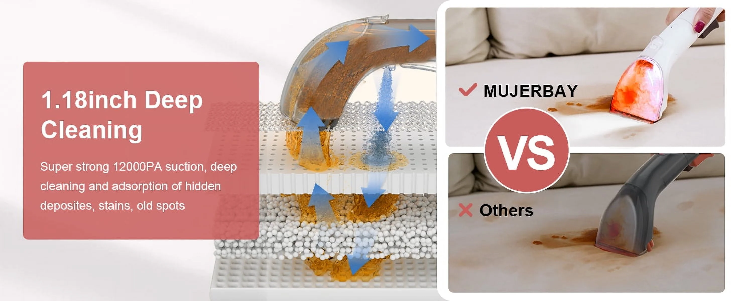 $188.33Original price was: $188.33.$94.59Current price is: $94.59.This powerful upholstery and carpet cleaner from MUJERBAY features high-pressure spraying and 12Kpa strong suction to effortlessly deep clean up to 1.18-inch, tackling tough messes like mud, wine, and pet stains throughout your home. With 360° universal wheels and handles, it offers exceptional maneuverability and portability, while the separate clean water and sewage tanks with easy top-filling design ensure hassle-free operation. The included water sucker with brush and right-angled sucker provide thorough cleaning, and the one-touch self-cleaning feature helps prevent odor and secondary pollution. Backed by a 30-day money-back guarantee, 1-year warranty, and lifetime technical consultation, this versatile cleaner is a must-have for keeping your home spotless.