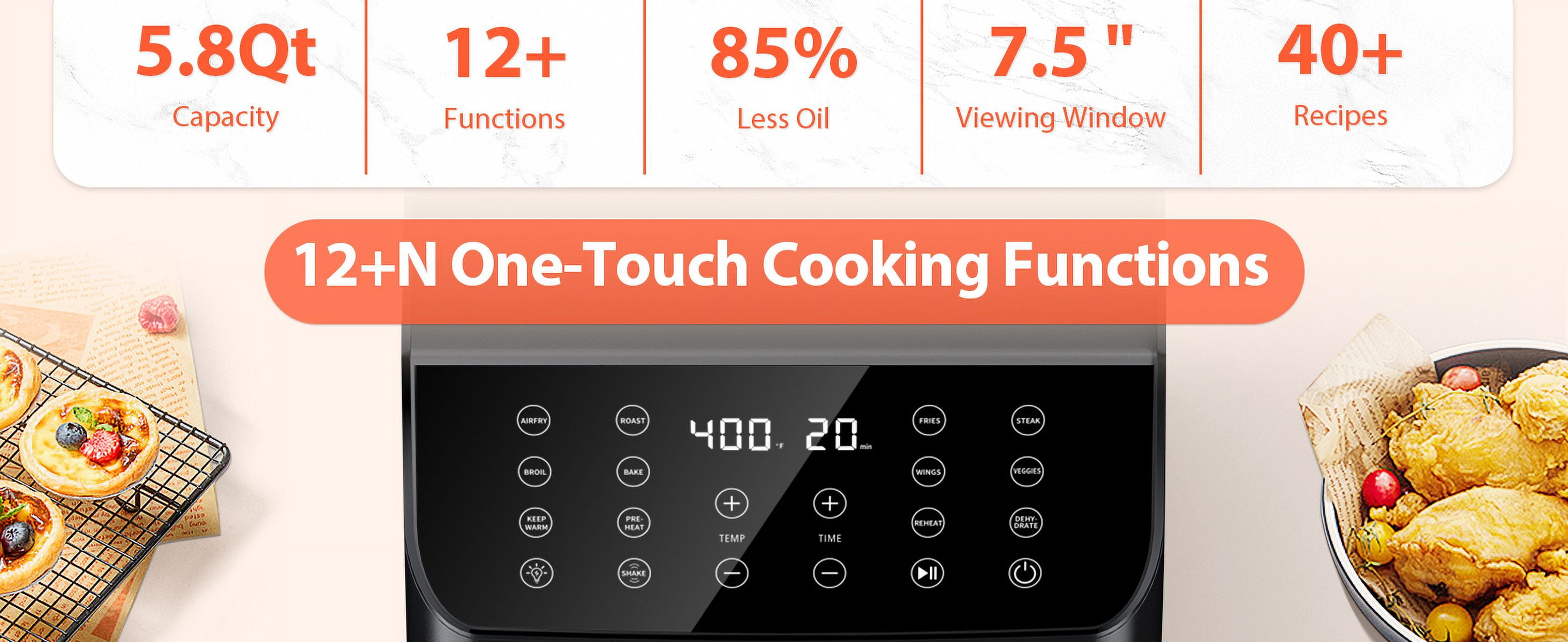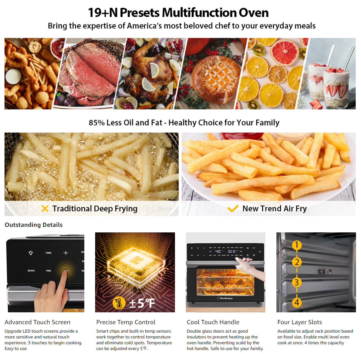$378.39Original price was: $378.39.$197.79Current price is: $197.79.【Luxurious Series】- Air Fryer Convection Oven -【Extra-large air fryer oven】: Product Outside Size: 18” L x 16.9” W x 14.4”H Product Interior Size: 14.2” L x 13.7” W x 9.3”H, 32 QT capacity for large family daily cooking and home party. -【19+N Presets Multi-function】 Replacing several appliances with only one machine saves the counter-top spaces and makes the kitchen cleaner and neater, brings the expertise of America’s most beloved chef to your everyday meals. -【Full touch screen premium】 Upgrade LED touch screens provide a more sensitive and natural touch experience. 3 touches to begin cooking. Easy to use.