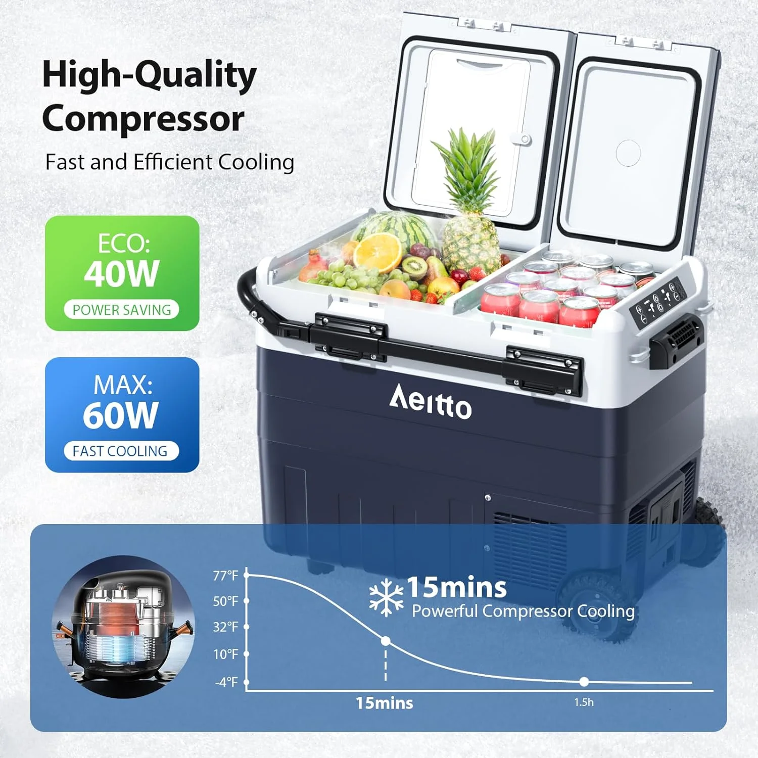 $318.19Original price was: $318.19.$300.99Current price is: $300.99.Enjoy the convenience of the Aeitto 12V Car Refrigerator, featuring a dual-zone temperature control that can function as both a freezer and a cooler, with a cooling range of -4°F to 68°F. This versatile refrigerator supports multiple power connections, including vehicle power and household outlets, and offers energy-saving modes and battery protection features to ensure optimal performance and safety. Its user-friendly design includes retractable tie rods, sturdy wheels, and a built-in cutting board, making it perfect for travel, camping, RV, and home use. With low noise operation and a 30-degree anti-shaking function, this refrigerator provides a comfortable and reliable cooling solution for all your needs.
