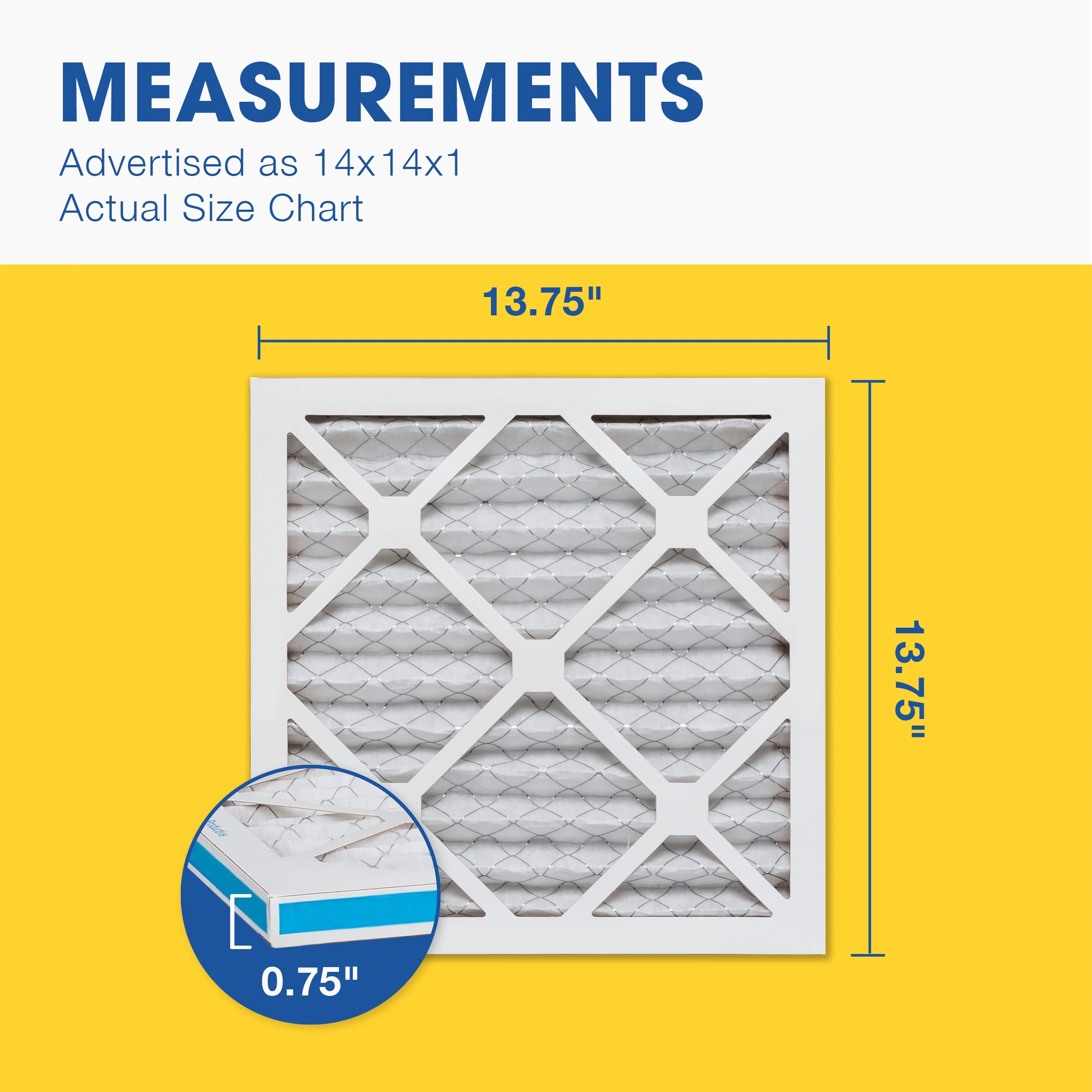 $52.19Aerostar 14x14x1 MERV 11 Pleated Air Filters (Actual Size: 13 3/4″ x 13 3/4″ x 3/4″) – 6 Pack. Aerostar filters are a simple and cost effective step towards a healthier home environment, free of airborne allergens and particles that can trigger various allergy and asthma symptoms. Made with electrostatically charged synthetic material, these MERV 11 (comparable to MPR 1000-1200 and FPR 7) filters draw and capture allergens between 1 – 3 microns, including lint, dust mites, spores, pollen, pet dander, fine dust, and smoke. Aerostar air filters also improve the efficiency of your HVAC unit by removing dirt and reducing strain on the motor, reducing utility and maintenance costs. For best results, change the filter every 60 to 90 days and increase frequency to every 30 days during peak summer and winter months when your unit is working the hardest. Compatible with furnace and air conditioner units, and easy to install.