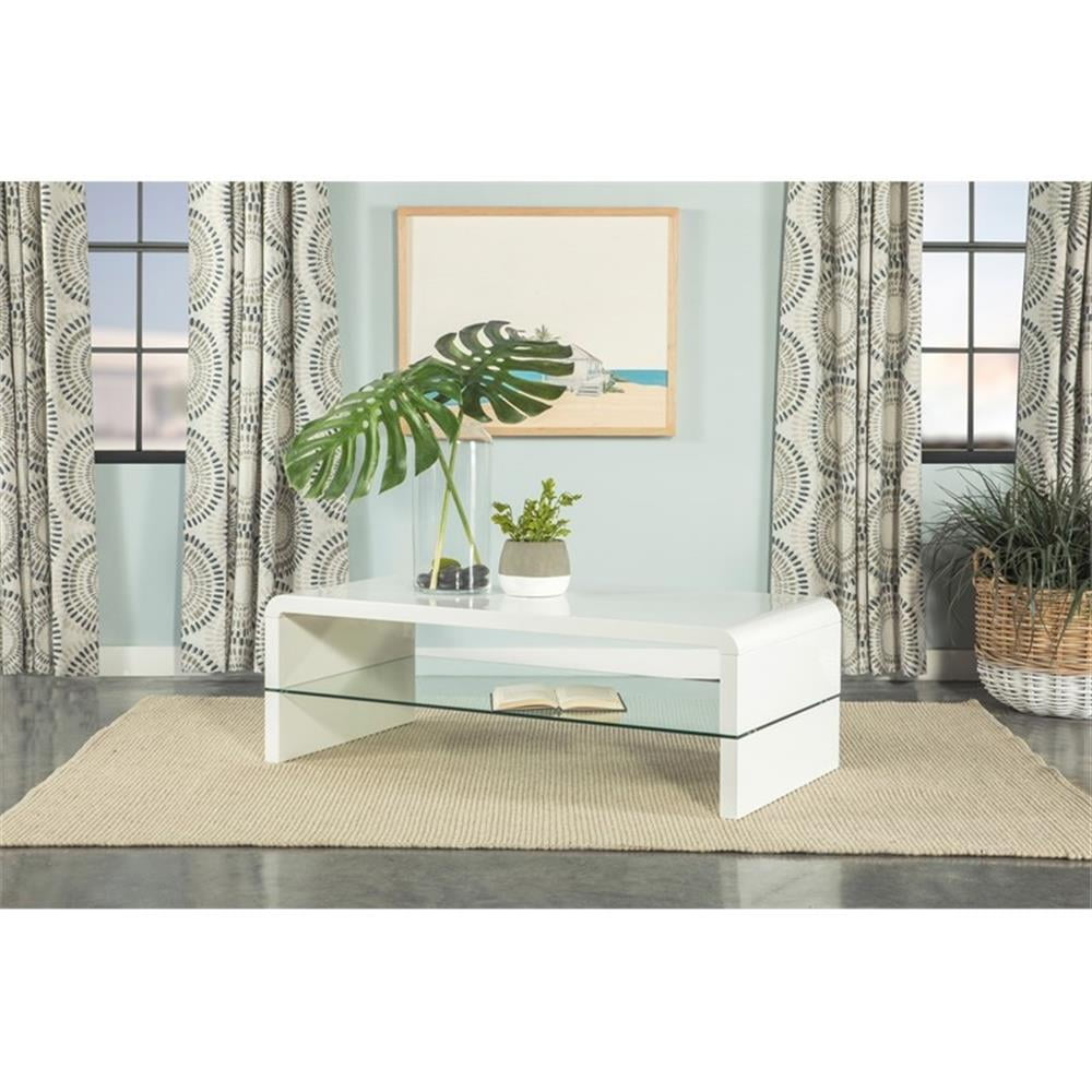 $257.99A smooth high-gloss finish and white tone lend a clean look to this modern coffee table. Designed with a rectangular tabletop that flows over an elegant waterfall edge into a plank-style base, this coffee table boasts an extraordinarily unique silhouette that gives off contemporary vibes. Sandwiched between is a clear tempered glass shelf that lends a utilitarian touch and open, airy look. Store items and showcase coffee table photography books to give your space an art studio-inspired aesthetic. Sleek surfaces and clean-cut lines push the boundaries of this stunning, modern coffee table. Features: Includes: One (1) coffee table Finish: White High Gloss Materials: MDF, Glass, Wood Stylish modern design Rectangular shape featuring clean lines with soft rounded edges Tempered glass shelf for storage or display Constructed with MDF and 8mm tempered glass Leveler/ plastic glide: Plastic glide Shape: Rectangular Specifications: Product Dimensions: 15.75″H x 47.25″W x 23.5″D Product Weight: 72.6 lbs Number of Shelves: 1 Assembly Required: Yes Warranty: One (1) year limited manufacturer warranty