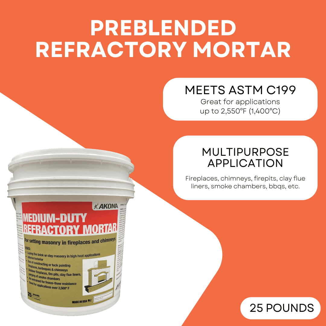 $43.39Akona Medium-Duty Refractory Mortar is a dry, preblended mortar ideally suited for setting masonry units in fireplaces (outdoor or indoor), fire pits, BBQs, or chimney applications such as setting clay flue liners. Our refractory mortar is air-entrained for freeze-thaw resistance, offers great workability, high strength, and a one-hour working time. Good for temperatures up to 2,550°F and has passed ASTM C199, ASTM C1283, and ASTM E136. This 25-pound model is ideal for smaller jobs and those needing an easier handling container. Model number: 114266 (25 lb.) Quantity: 1 Multipack Quantity: 1
