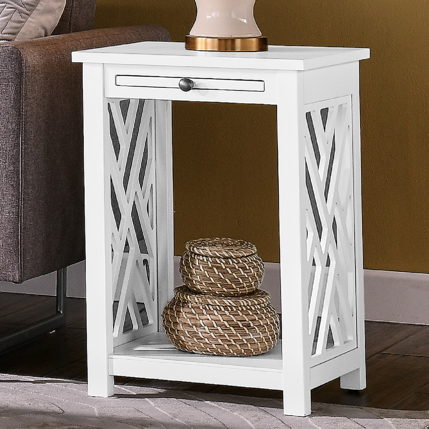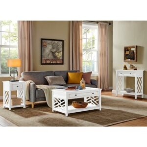 $51.60Alaterre Coventry Wood End Table with Tray Shelf and Bottom Shelf is a fresh, clean furniture piece included in our Coventry collection that is versatile in any space. The open-detailing on each side is airy and offers a unique look for your décor. This collection works in a range of decorating styles- from traditional to modern with its clean lines and decorative side-element. This versatile end table can be used in living room, entryway or even the kitchen. Perfect accent for any space and coordinates effortlessly with many decorating styles.