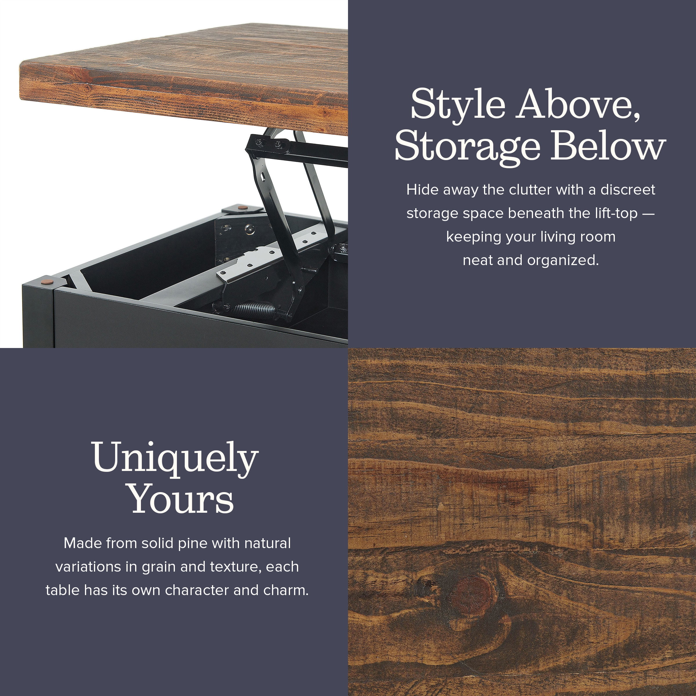 $275.19The Pomona collection features the exquisite workmanship of a solid wood top with metal legs that will last for years to come. Each piece is constructed of solid pine wood and finished to have the appearance of reclaimed wood. The reclaimed wood finish highlights natural wood variations such as cracks and knots which add to the piece’s character. This coffee table with a lift top offers a spacious top surface that lifts up and towards you to create a versatile surface that allows you to work on projects, browse on your laptop, or enjoy a snack all while relaxing from the comfort of your own couch. Any item in this collection will add to the rustic industrial style of any space.