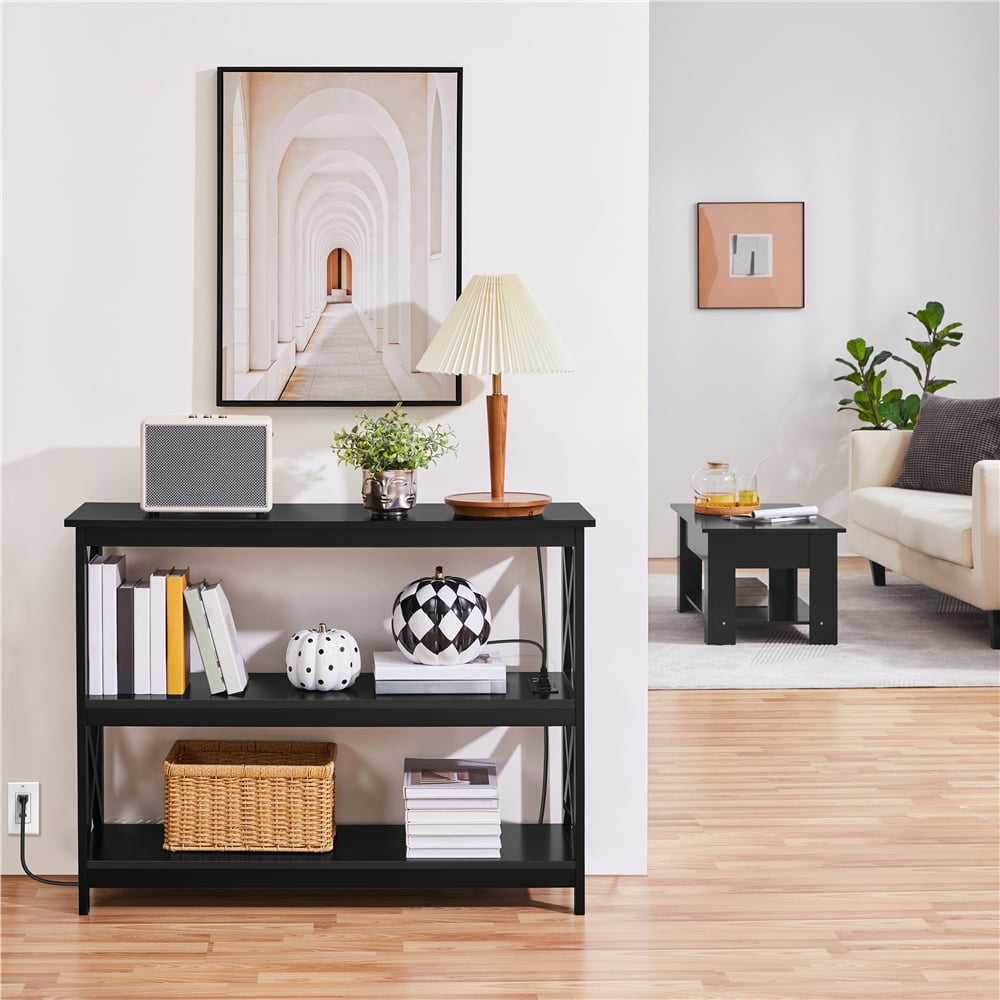 Alden Design 3-Tier Wooden Console Table with Power Outlet for Living Room, Black