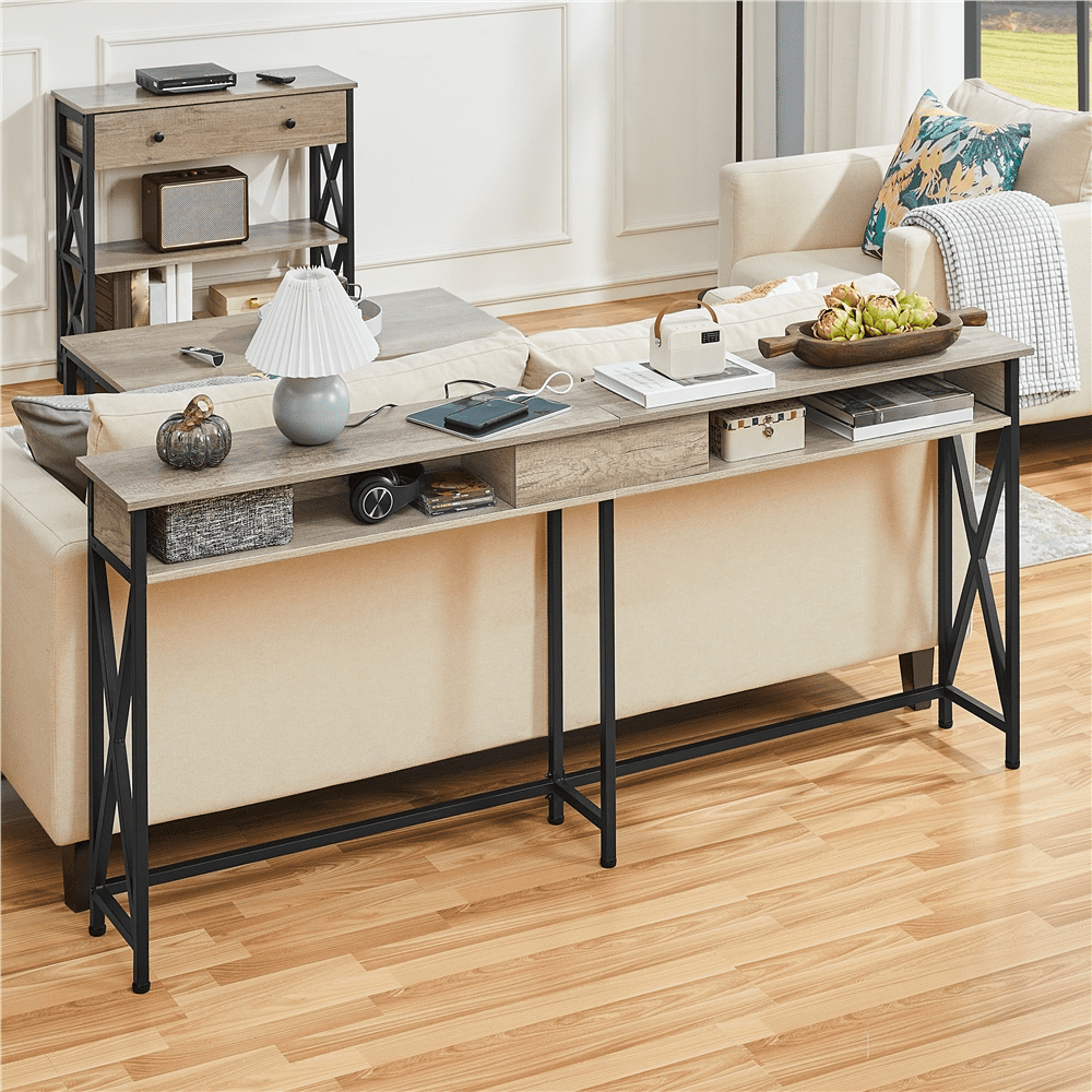 $74.81Made of high-quality MDF and iron and designed in a modern vintage style, let this 71″ extended console table complement your stylish living space! The long console tabletop with two open storage compartments can accommodate more items, which is suitable for a relatively large space, such as in a large living room against the wall to display items like decorations, a vintage lamp, candles, a silver set, lush plant, frame, a coffee maker and tools, or against your sofa in the middle of the hall to serve as a partition. The built-in power station facilitates charging your electrical appliances. The cable management box keeps the wires invisible and dust-free.