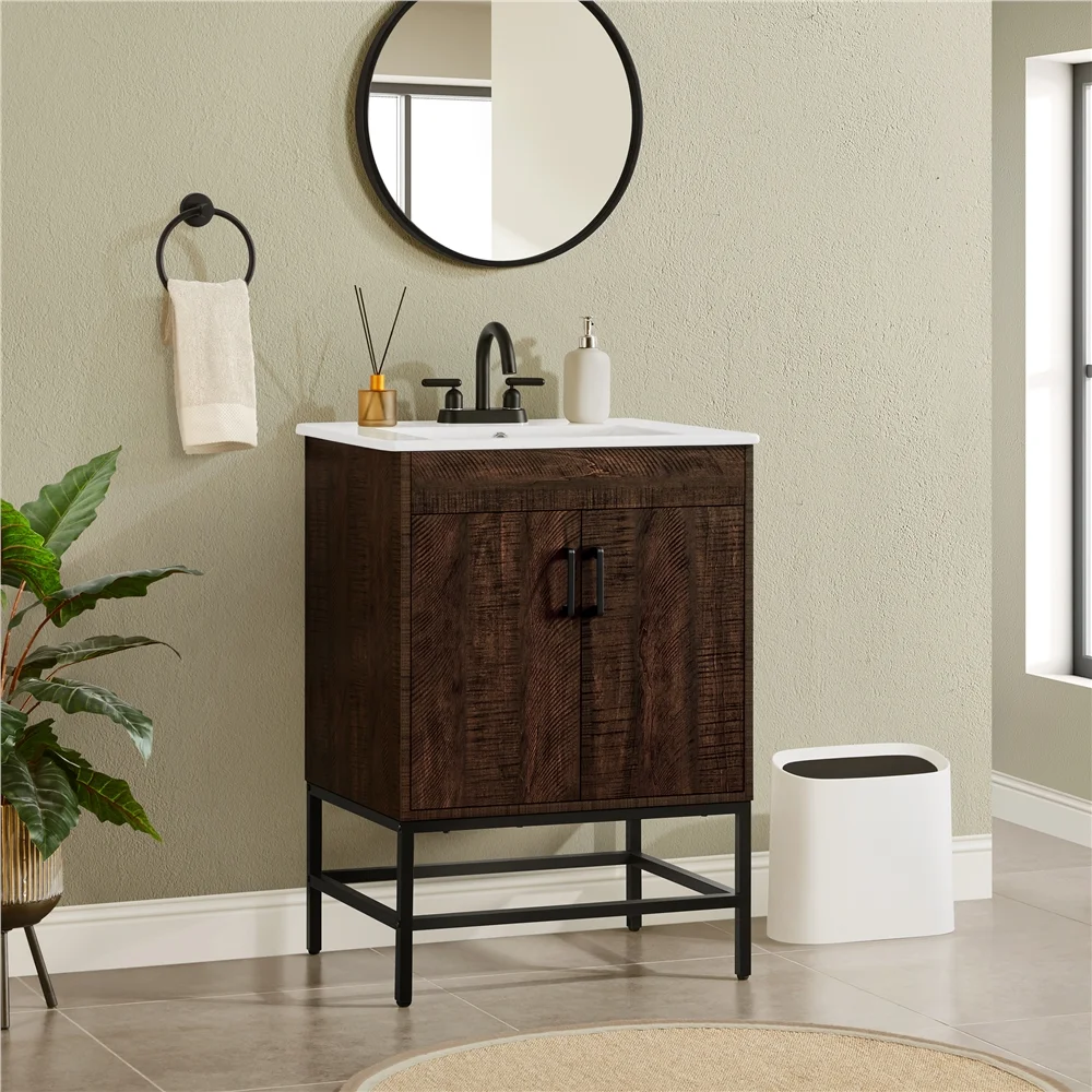 $145.33Bring a clean and rigorous temperament to your home. This bathroom vanity is equipped with a white ceramic basin, and a dark brown finish, making it versatile for any home decor and creating a vintage style. It is constructed with sturdy metal legs, CARB P2-compliant MDF, and a freestanding ceramic sink for enhanced durability and stability. The elegant white ceramic basin features an anti-overflow hole, an integrated drain hole, and a three-hole faucet mount. With a spacious countertop and a two-door cabinet under the sink, this wooden bathroom cabinet offers ample storage, enabling efficient bathroom organization and maintaining a clutter-free space.