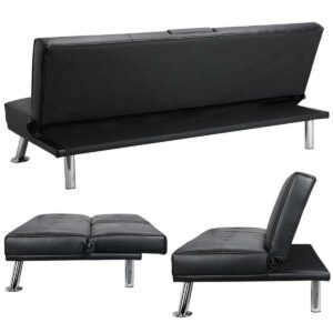 $146.15This futon sofa bed is made of high quality artificial leather and iron material. It is sturdy and durable to use. This home recliner couch can be transformed into a quick guest bed for visitors by removing the armrest and reclining the back rest. The futon sofa bed is designed for entertainment. The ergonomically designed sofa bed has a middle armrest that folds down with two cup holders, so you and your friend can relax and enjoy a couple of beverages. The sofa bed is perfect for small spaces and well-suited for any apartment, studio or college dorm, living room, bedroom, or den as an extra guest bed.