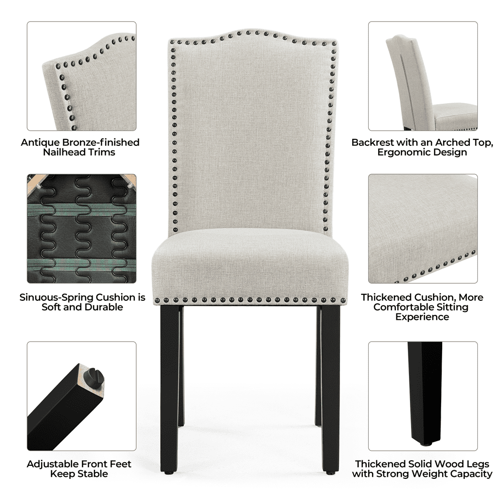 $142.76Are you looking for some classic-style chairs for your dining room? This pack of 2 fabric armless chairs may be a great choice. Covered by breathable polyester fabric, the seat is padded with high-density foam for a better seating experience. Also, this contemporary kitchen chair is designed with an ergonomically curved backrest. The sturdy rubberwood legs with protective pads enhance overall stability and durability, and each chair can hold up to 136 kg / 300 lb. Furthermore, bronze-finish studs adorn the backrest and seat, a superb detail that adds the classical look of the chair.