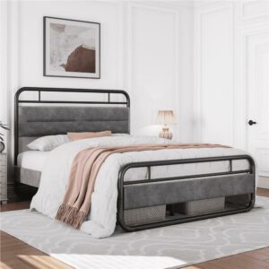 Alden Design Queen Size Metal Platform Bed with Velvet Upholstered Headboard,Dark Gray