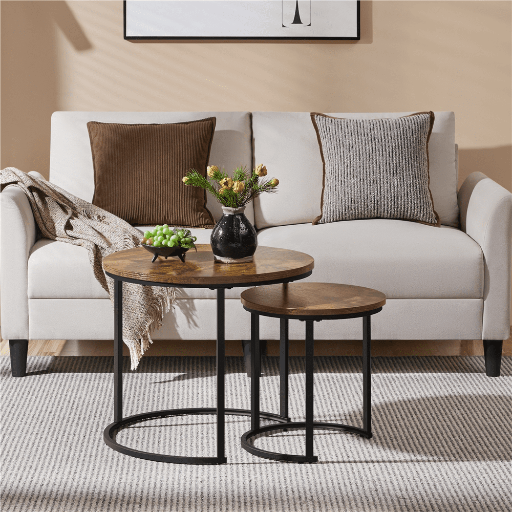 $68.80This round nesting coffee table perfectly combines function and industrial modern style. The modern coffee table set features a matte black finished iron frame with a nesting design that allows you to easily move the smaller coffee table into the other. The tabletop is built of premium MDF boards, which provides you a perfect place to drink coffee, read books or socialize with your friends. With the waterproof and scratch-resistant covering, so you can simply wipe it clean with a dry cloth as needed. The combination of classic curved silhouettes and wood-like grain makes the set ideal for the living room, guestroom, balcony, office, apartment and small space.