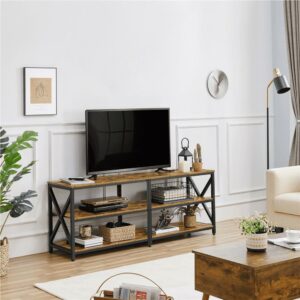 Alden Design Wood and Metal 3-Tier TV Stand for TVs Up to 70″, Rustic Brown