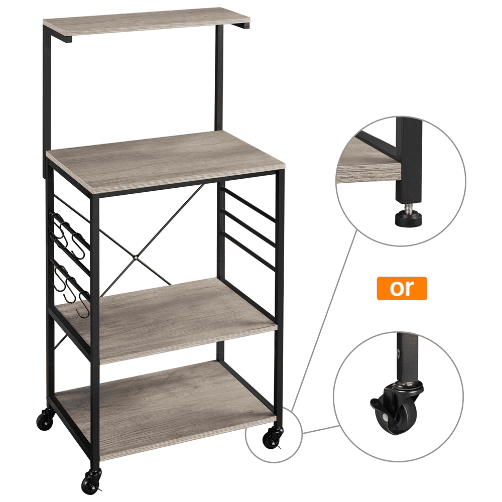 $55.16Still having trouble tidying up your messy kitchen and looking for a practical but stylish kitchen organizer to gather all of the kitchen utensils? Keep all your kitchen necessities close at hand while adding a touch of rustic but stylish appeal with this 4-tier microwave stand cart. The rolling 4 tires wooden rack is crafted of a sturdy metal frame and the shelves use premium thick particle board. This utility kitchen island offers four multi-sized shelves to organize your go-to kitchen needs like kitchenware or spice jars and some smaller appliances like microwaves, coffee makers. The classic gray color can coordinate with a variety of styles, especially rustic barn-style and industrial design, it will not only be a good helper but also be a unique décor in your kitchen.It’s a good choice to own this storage shelf unit in your kitchen. You can keep your spice jars and bottles on the top shelf, and fill up the rest three lower shelves with a microwave oven, pots and other appliances. Kitchenware like spoons, scoops, knives can be hung on the 6 S hooks.