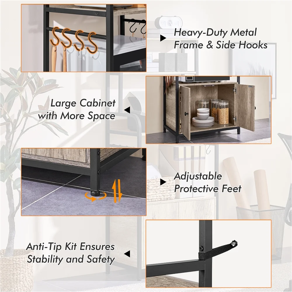 $88.57Declutter your kitchen or living room with this chic utility storage shelf with a cabinet. Founded atop four legs in a matte black finish, this piece features a quality iron frame, CARB P2 compliant manufactured wood, and water- and heat-resistant veneer that’s very easy to clean. Offering 3 multi-sized open shelves and a roomy storage compartment, you can put go-to kitchen needs and smaller appliances like microwaves, and coffee makers corralled and handy. Eight ball-end S-hooks keep potholders, mugs, and dishcloths dry and clean. The weather-worn look contrasts nicely against the black metal frame, which makes this baker’s rack a perfect addition to a variety of styles, especially rustic barn-style and industrial design.