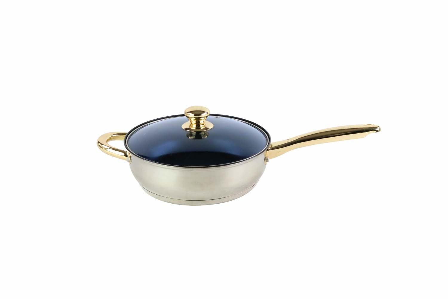 $81.7013pc Stainless Steel Cookware Set With Capsulated Bottom And Gold plating. It contains a blue glass lid and capsuled bottom with gold plating, it has a stainless steel hollow handle. It contains 16cm that is 2.2qt casserole with lid, 14cm that is 1.8qt milk pot with lid,18cm that is 3qt casserole with lid,24cm that is 4.1qt casserole with lid,24cm that is a 6.9qt stock pot with lid,24cm that is 6.9qt non stick coated fry pan with lid marble coated. It contains stainless steel steamer and a blue glass lit. The cookware is stainless steel with gold plating bottom.