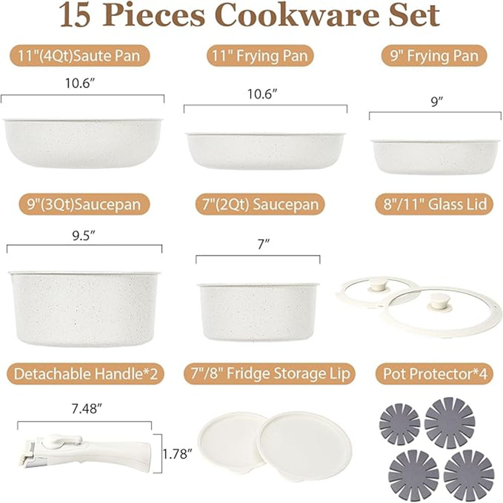 15 Piece Pot and Pan Set, Nonstick Kitchen Cookware, Removable Handles, RV Nonstick Cookware Set, Oven Safe, Induction – White