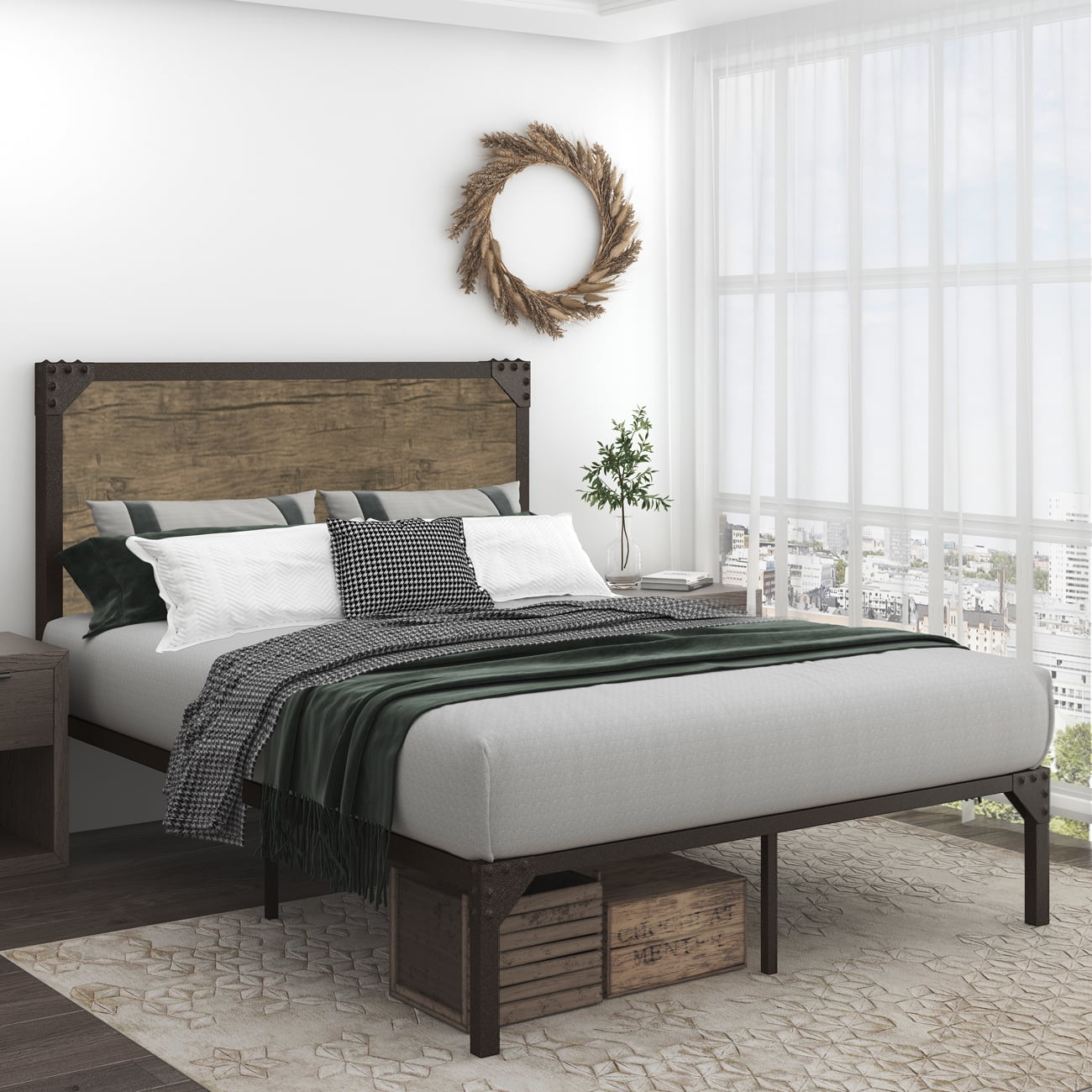 Allewie Queen Size Industrial Platform Metal Bed Frame with Wooden Rivet Headboard, Strong Steel Slat Support, 11″ Under-bed Storage, Brown