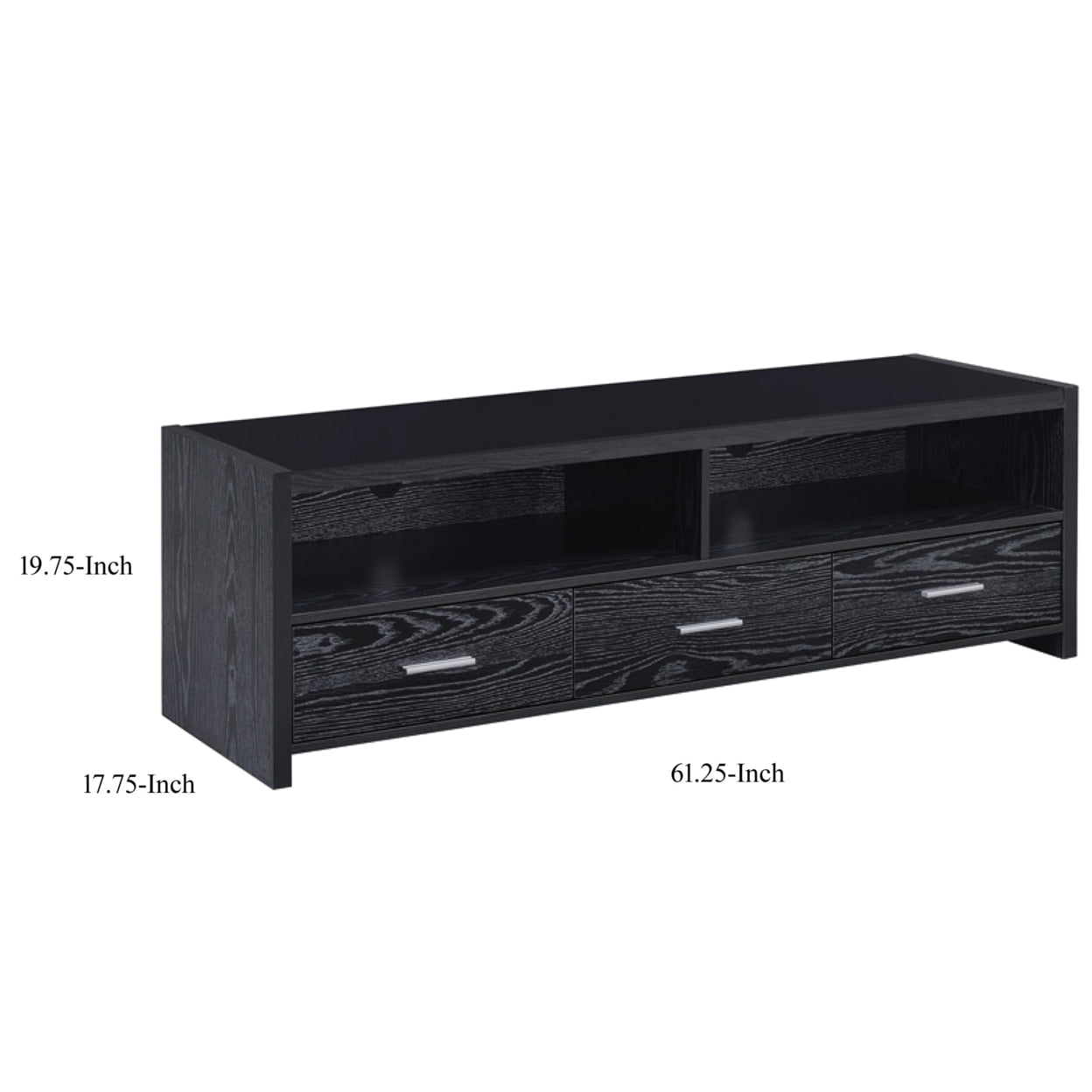 $248.54Sleek and modern, this TV console is a stylish choice. Exquisitely crafted from black oak, it boasts a classy, contemporary appeal that looks lovely in a den or family room. Brushed silver hardware creates a striking contrast to its bold, black finish. Three large drawers and two spacious compartments offer plenty of storage for electronics, games, movies, and more. Whether you’re gathering loved ones for movie night or enjoying a gaming marathon, this console provides hours upon hours of entertainment. Features: Includes: One (1) TV console Finish: Black Oak Hardware finish: Silver Materials: MDF, Metal, Particle Board, Hollow Board, Engineered Veneer Features two (2) storage compartments and three (3) storage drawers Euro drawer glides Drawer Construction: Front cam bolt with nut and back screw construction Leveler/plastic glide: Plastic glide Max TV size: 65″ Max TV weight: 88 lbs Number of compartments: 6 Hardware type: Pull handle Leveler/ plastic glide: Plastic glide Specifications: Product Dimensions: 19.75″H x 61.25″W x 17.75″D Product Weight: 105.6 lbs Number of Shelves: 2 Number of Drawers: 3 Assembly Required: Yes Warranty: One (1) year limited manufacturer warranty