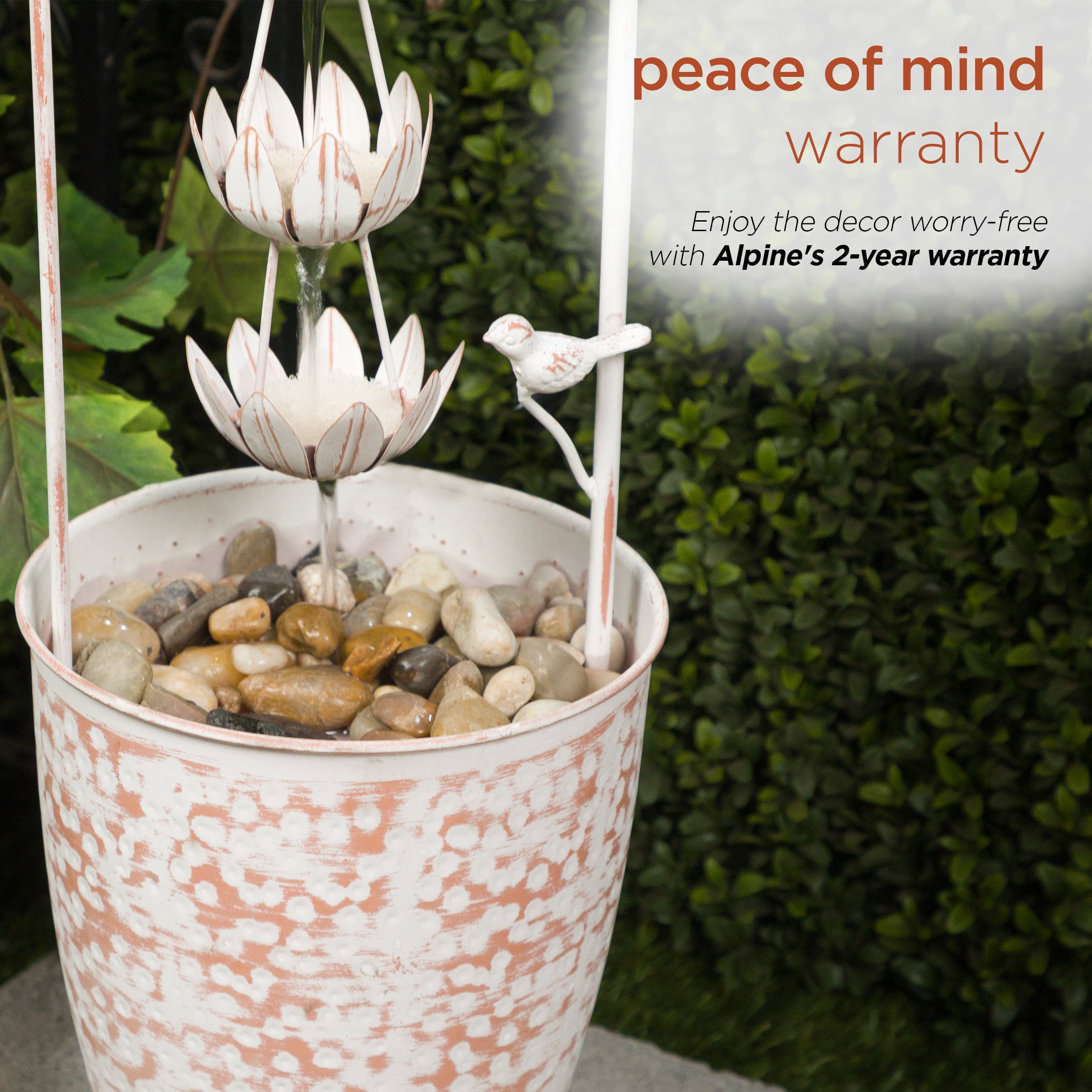 $83.24Original price was: $83.24.$74.05Current price is: $74.05.Transform your outdoor space into a serene retreat with the Alpine Corporation Metal White Rustic Fountain, adorned with a delicate flower. Measuring 8″L x 8″W x 30″H and crafted from durable iron, this fountain is a perfect blend of rustic charm and timeless elegance. The distressed white finish adds a touch of vintage allure, creating a visually appealing centerpiece for your garden or patio. Thoughtfully designed, this compact fountain enhances your outdoor decor without overwhelming the space. The gentle flow of water from the flower accentuates the rustic aesthetic, bringing a sense of tranquility to your surroundings. Designed for outdoor use only, this fountain becomes the focal point of your garden oasis. With Alpine’s 2-year warranty, you can Shop With Assurance and Buy With Confidence.