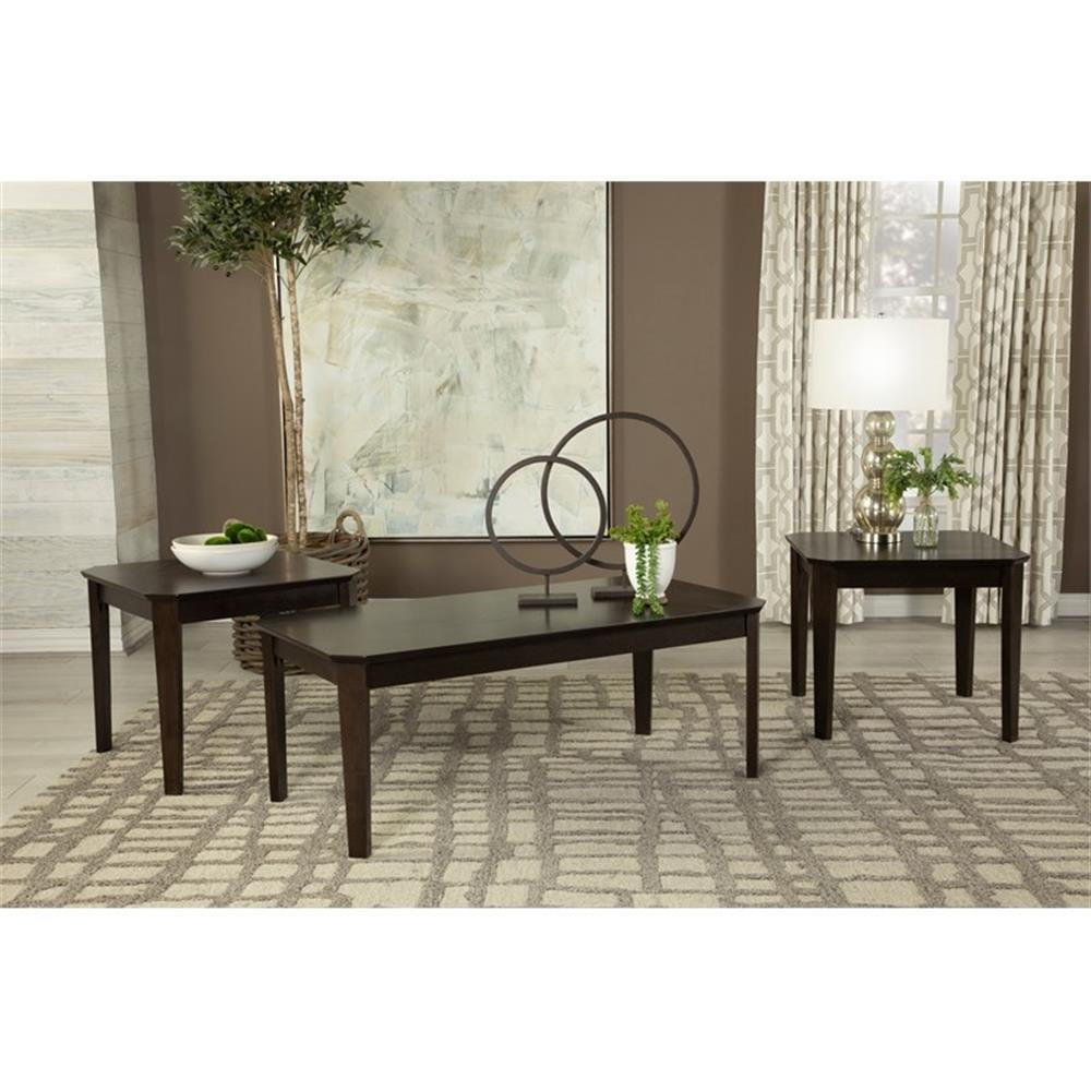 $239.94Casual style and simple lines enhance this three-piece occasional table set. Complete with a coffee table and two end tables, each furniture piece offers a rich, dark brown finish that lends a traditional flair. A smooth tabletop also features notched corners that soften the edges. Slim and straight legs extend to the floor and offer a subtle tapered foot. Place this coffee table and two end tables in a compact living room space for a touch of warmth and class. Features: Includes: One (1) coffee table and two (2) end tables Finish: Dark Brown Materials: Asian hardwood, okume veneer, MDF Perfect trio for smaller-scale furniture Three piece set includes rectangular coffee table and two square end tables Table top edge profile: Reserve profile Specifications: Product Dimensions: Coffee table – 18″H x 47.25″W x 23.5″D Product Dimensions: End table – 20.25″H x 23.5″W x 23.5″D Product Weight: Overall – 69.47 lbs Product Weight: Coffee table – 30.89 lbs Product Weight: End table – 19.29 lbs Assembly Required: Yes Assembly details: Full assembly required Warranty: One (1) year limited manufacturer warranty