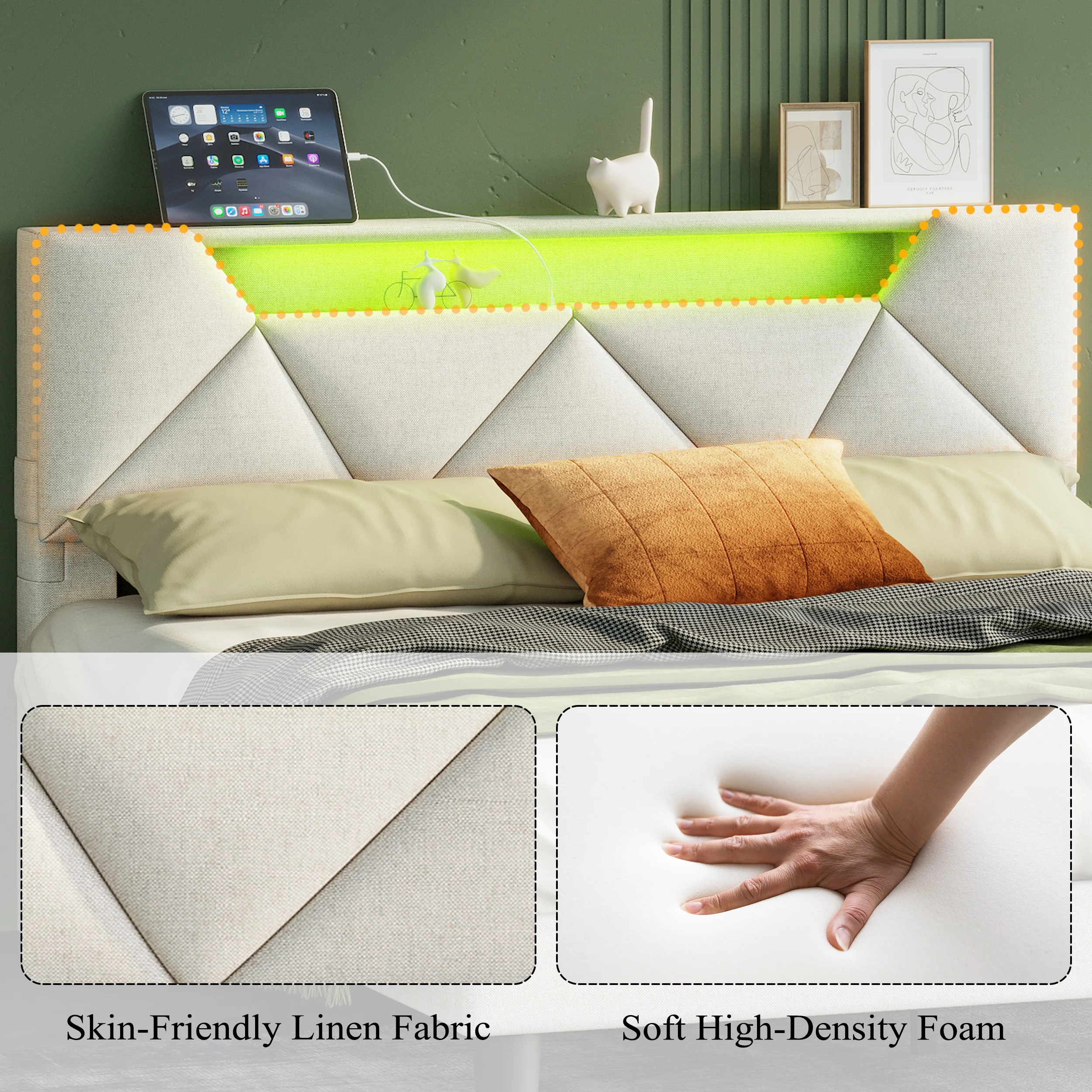 ANCTOR Queen Modern Linen Standard Bed with USB Ports, Beige