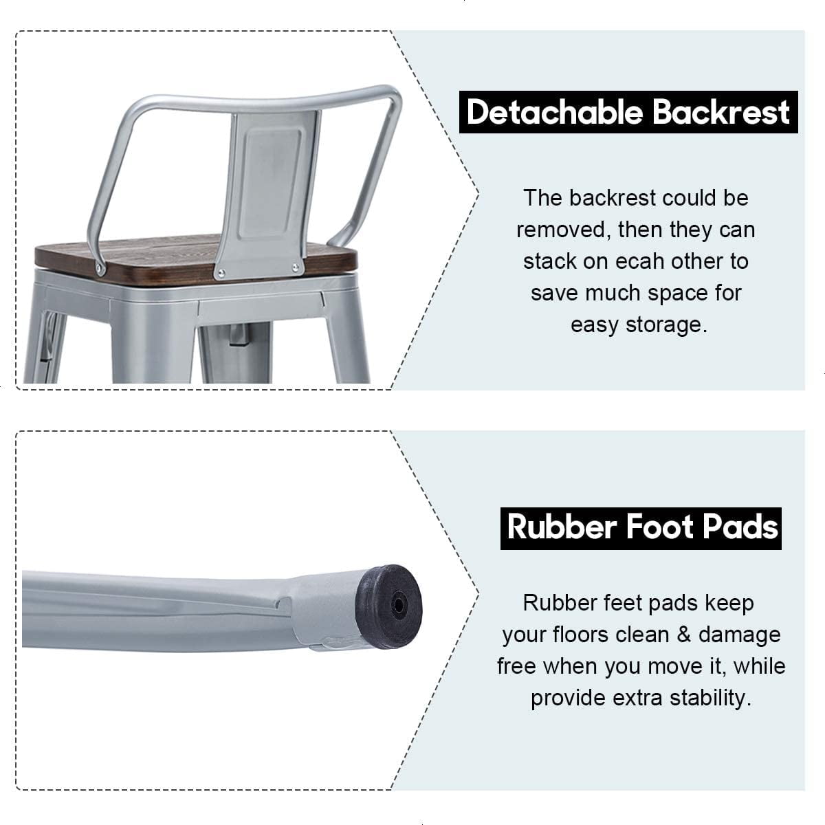 Andeworld Metal Bar Stools Set of 4 Kitchen Counter Height Barstools (24″, Silver Wood Top Low Back)