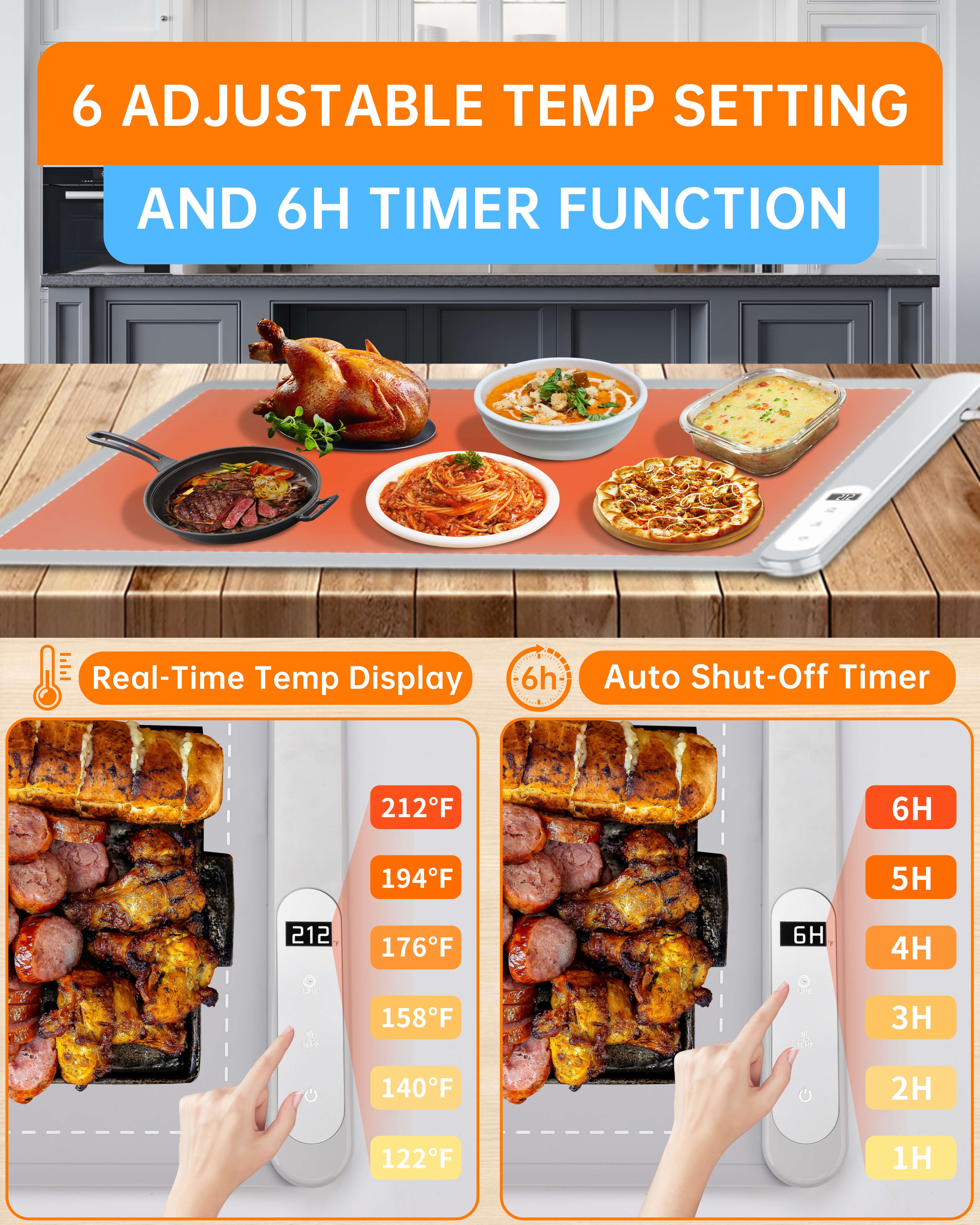 $45.57Aotto food warming mat for buffet parties keeps your food warm for up to 6 hours with a 6-level temperature control, ensuring a delicious and enjoyable dining experience for you and your family. Our electric warming tray is made of flexible silicone and has splash-proof, stain- and oil-resistant properties. Easy to clean. After use, it can be folded and stored, can be placed on the dining table, kitchen corners, or storage bags. It is an excellent choice for a hot plate. These heating trays keep food warm at parties, birthday, Christmas time, and buffets.