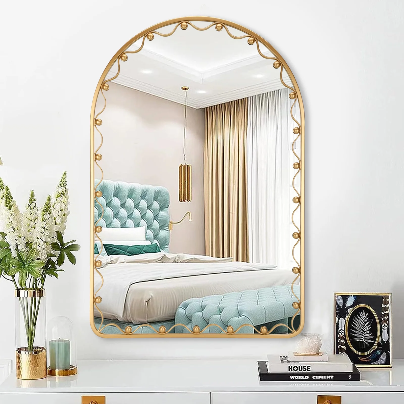 $56.7530″x20″ ARCH WALL MIRRORS – This decorative wall mount mirror features rounded arch shap, wavy design gold frame, which completes a modern-style decor. The gold arched mirror measures 20″W x 30″L. The chic arched mirror can be placed in any corner of the home to blend different styles. HD & HIGH-QUALITY MATERIAL – Our artistic luxury gold mirror adopts to upgraded no-distortion 4MM HD silver glass mirror to deliver clear reflection, simple modern design. This large bathroom mirror, made of heavy duty strong cast iron with gold finish, weighs 10.58 lbs. This sturdy, durable, anti-scratch, corrosion resistant and non-rusting mirror is ideal for bathroom.