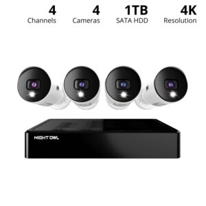 Night Owl Security Camera System CCTV, 12 Channel DVR with 1TB Hard Drive, 4 Wired 4K Ultra HD Spotlight Surveillance Bullet Cameras, Indoor Outdoor Cameras with Night Vision