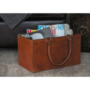 DecMode Rustic Leather Brown Rectangular Magazine Holder with Strap Handles, 15″W x 16″H