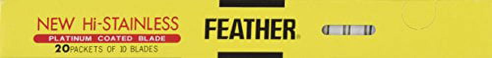 $50.74200 Feather Razor Blades NEW Hi-Stainless Double Edge. Sharp razor blades from Feather, made in Japan. Fit all traditional double edge safety razors. These sharp double edge blades are made from high class stainless steel, which has been surface treated with platinum for optimal comfort. A double edge razor blade lasts 3-5 times as long as the popular 3-blade systems. You can easily get 6-8 shaves with one blade! Feather Double Edge Razor Blades come in 10 blade tucks.