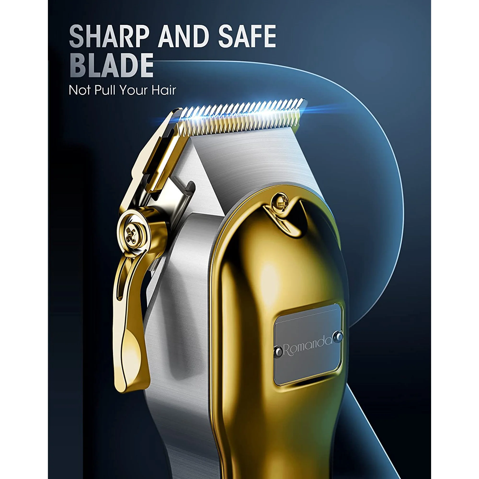 $34.39Romanda 2 in 1 Beard Trimmer for Men, Heavy Duty Hair Clippers for Men with Stainless Steel Design & Powerful Motor, 2500mAh Battery – Gold High-Lights: ➤Self-sharp Stainless Steel Blade: Designed with upgrade carbon steel blade, The hair clipper is sharp enough which offer you fast, smooth and precise hair cutting.The super sharp blade can help you quickly cutting without stuck hair and no damage to skin surface. ➤0.8mm -25.8mm Haircut Length: With a adjustable lever and 8 different guide attachments, it is set for wide range of length from 0.8mm to 25.8mm ➤Long Battery Life: A 3-hour charge can support for 300 minutes’ use. Convenient charging with computers, laptops, portable power, adapters, etc. ➤LCD Battery Display: LCD digital display can clearly tell you the amount of power left . ➤Easy Self-haircut for Mens: You can easily cut the hair on the back of your head without any assistance with this cordless hair clippers. Its sharp steel blades will not pulling your hair ➤Stainless Steel Design: The hair clippers and an all metal body, very professional feeling. Designed by precision stainless steel blades, which can be washed by running water directly, durable-to-use, and easy-to-clean. Stainless steel materials can reduce vibration during use. ➤Heavy-Duty Motor: The electric hair clipper’s motor is powerful enough to cut through even the thickest hair with ease.it’s less than 60 db, cuts through the thickest of hair with no snags or pulls.Even if only 15% power remains strong,providing you a perfect haircuting experience for you. Friendly for the first-user to cut hair at home. ➤8 Pcs Different Color Coded Guide: Our hair cuting kit with 8 clolor guide combs(1/8″,1/4″,3/8″,1/2″,5/8″,3/4″,7/8″/1″),remembering everyone’s favorite hair length is easier . Easy to see attachment guards to to the right cutting length.Meet for different hair lengths and face trimmer. ➤Good Gift for men: Heavy-Duty Design & Easy Operating, all of those features are determined that Romanda Clipper is good gift for men. About Romanda Hair Clippers for Men: Product Name: Romanda Hair Clipper Brand: Romanda Color: Gold Material: stainless steel Battery: 2500 mAh Battery type: premium Lithium Ion battery Charging time: 3 hours Working time: 300 minutes Size: 9.61 x 6.73 x 3.39 (inch) Weight: 2.01 (lbs) Sharp and safe blades: Stainless Steel Blades Hair cut lengths: from 0.8mm to 27.0mm 2 Rotational speeds: 6200/6500RPM 8 Guide Combs: 3-6-10-13-16-19-22-25mm Smart LCD display indicator: charging, refill lubricant ,turbo speed Romanda Trimmers Package Contents: 1 × Hair cutting scissors 1 × Barber cape 1 × Hair cutter comb 8 × Guide Combs (3/6/10/13/16/19/22/25mm) 1 × Charge plug adapter 1 × Cleaning Brush 1 × User manual