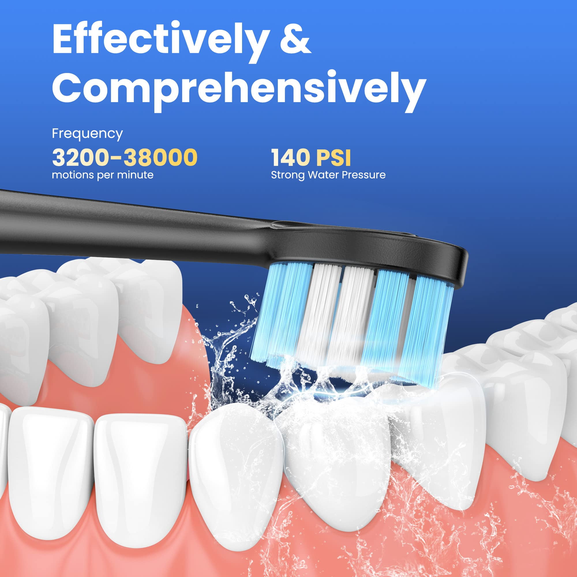 $85.83Switching from brushing to flossing with ease. It can spray water and brush at the same time. 3 water pressure: Strong, soft, pulse 4 brushing modes: Clean, soft, WL/PL, polish the sonic toothbrush cleans the surfaces of your teeth while the water flosser in the center of the brush head cleans between teeth and below the gumline where toothbrush bristles can’t reach. Effectively keep oral health.
