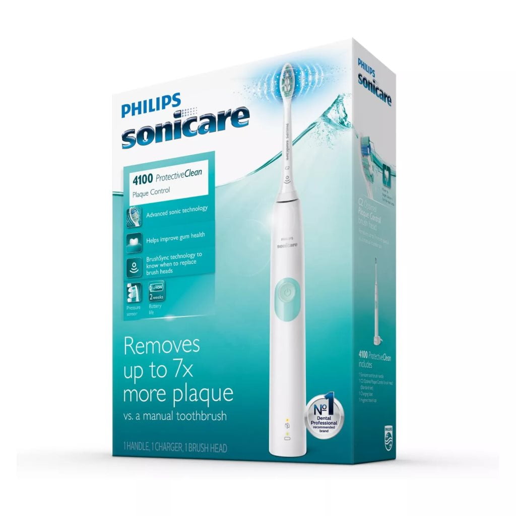 $60.14Original price was: $60.14.$36.89Current price is: $36.89.Your Sonicare brush head and handle are the ultimate team. The ProtectiveClean 4100 is a gentle power toothbrush with a pressure sensor that protects teeth and gums from excess brushing pressure. The snap-on Optimal Plaque Control brush head features densely-packed high-quality bristles that gives you extra gentle brushing removing up to 7x more plaque vs. a manual power toothbrush. Brush heads wear out over time. Our BrushSync technology tracks how long you have been using your brush head and how hard you have been brushing. It will beep to inform you when to replace your brush head. The easy-start feature slowly increases the power of the brush as you get used to the Sonicare experience and the smartimer encourages a full 2 minutes brushing time as recommended by your dental professional. The battery charge indicator light lets you know when it is time recharge; 2 week battery life. The kit includes 1 Philips Sonicare ProtectiveClean 4100 electric toothbrush Removes up to 7x more plaque vs. a manual toothbrushPressure sensor protects teeth and gums from excess brushing pressureAlways know when to replace your brush head for an effective clean with BrushSync replacement reminderQuadpacer and Smart timer helps ensure dental professional recommended 2 minute brushing time and encourages brushing in each quadrant of the mouthBatter charge indicator light let’s you know when to recharge; 2 week battery life