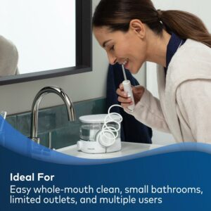 $39.05The Waterpik Nano WP-310 countertop water flosser in White delivers full-size water flosser performance in a compact and portable design, making it perfect for smaller spaces. The reservoir can be inverted for travel and convenient storage. Tested and trusted, Waterpik is the #1 water flosser brand recommended by dental professionals. From the first brand in its class accepted by the American Dental Association (ADA) for safety and effectiveness, the Waterpik Nano water flosser removes up to 99.9% of plaque and is clinically proven up to 50% more effective than string floss for improving gum health. Nano features a compact design that is 50 percent smaller than full-size models. It comes with 2 flossing tips, 3 pressure settings, a reservoir that inverts for compact storage, and a 2-year warranty.